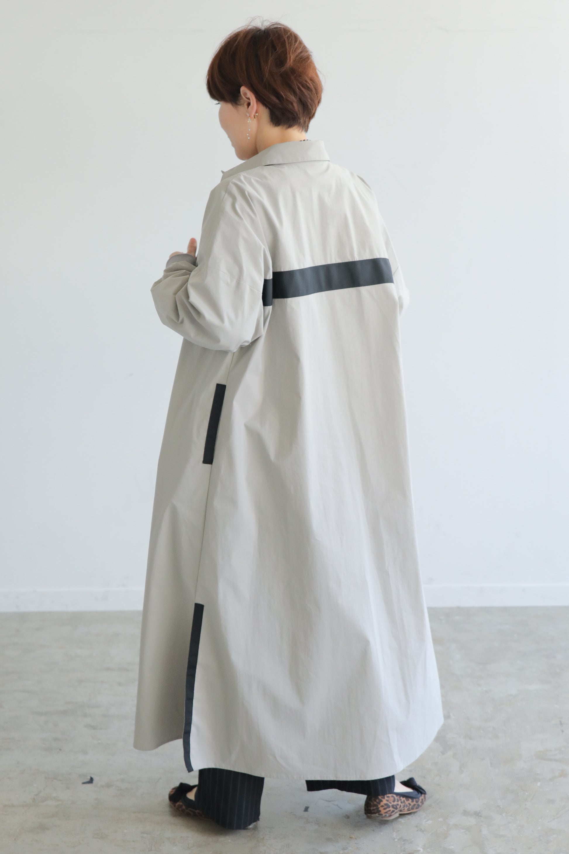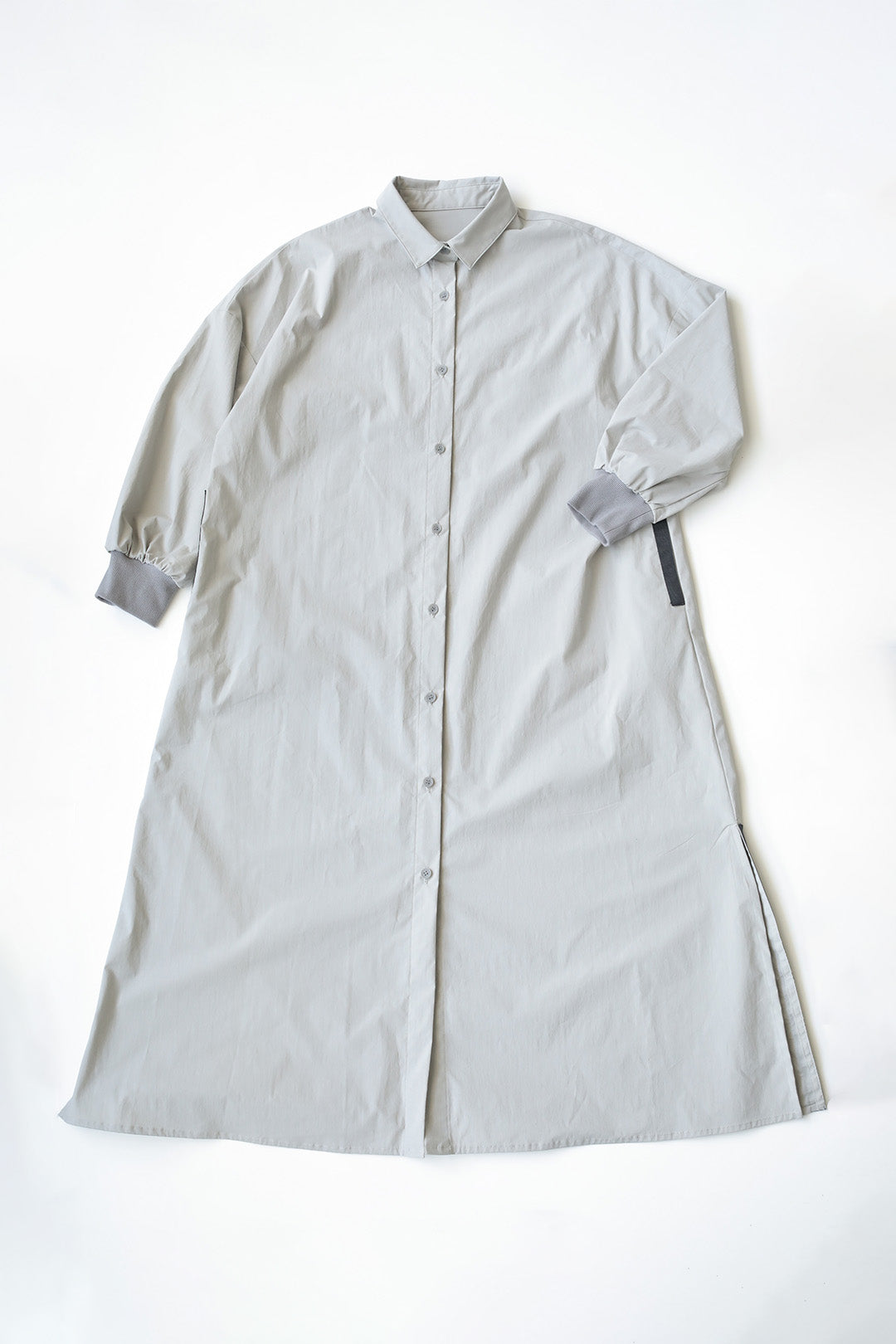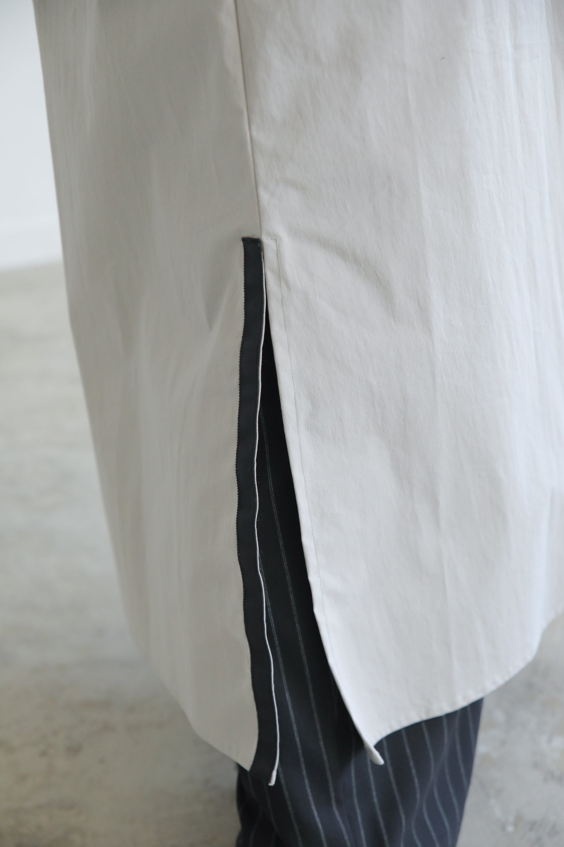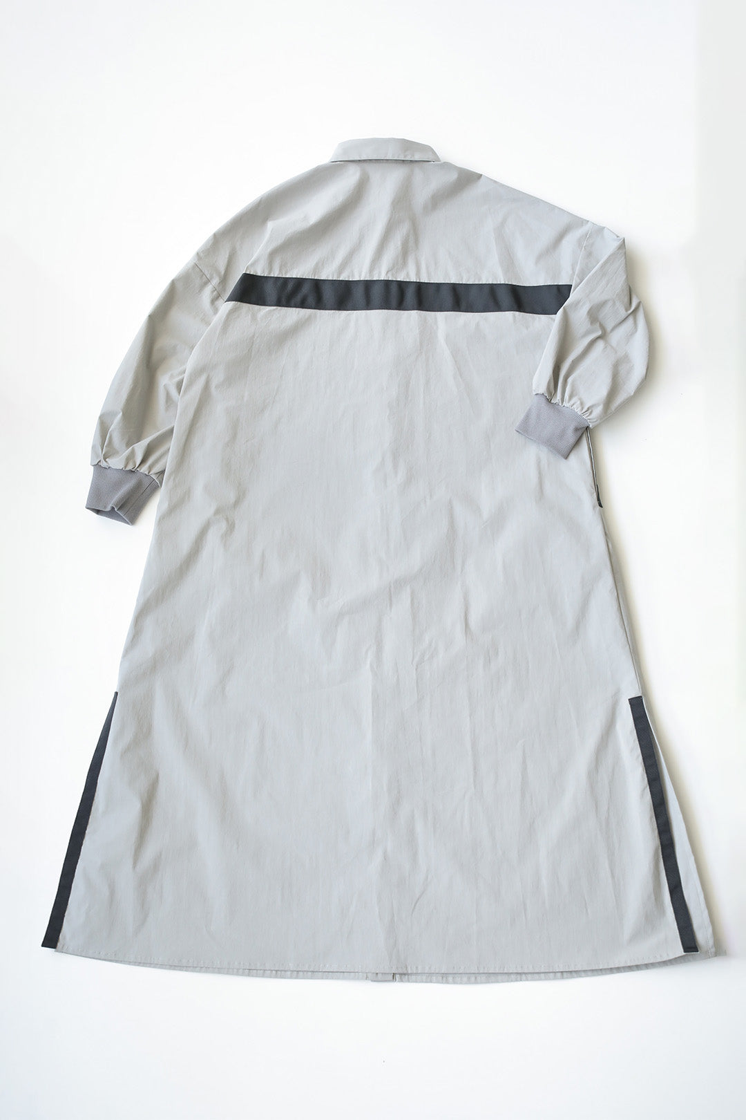 ハリのあるシャツ地に、背中のワンラインが映えるロング丈のシャツ羽織。前を開けて“羽織り”、閉じて“シャツワンピ”—2WAYでオンオフを横断。クリーンなきれいめ感に、スポーティなアクセントをひとさじ添えた主役級の一枚です。