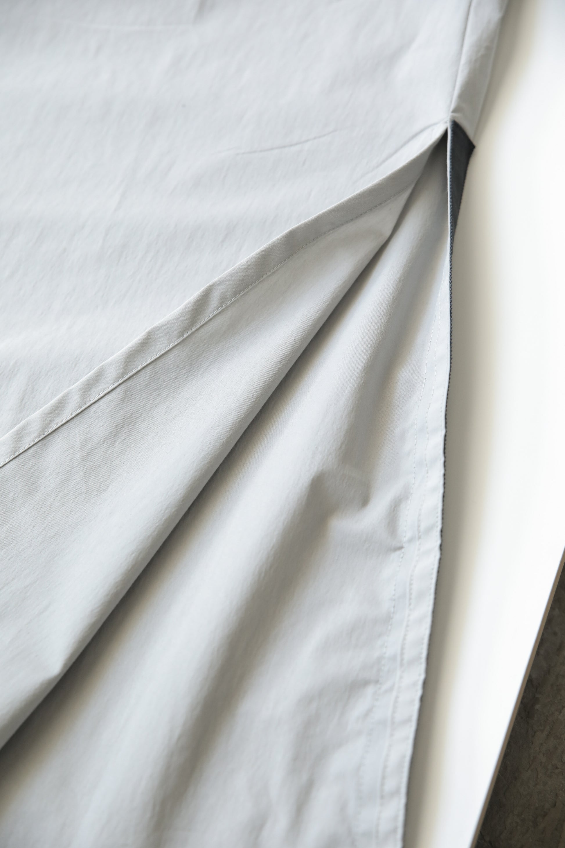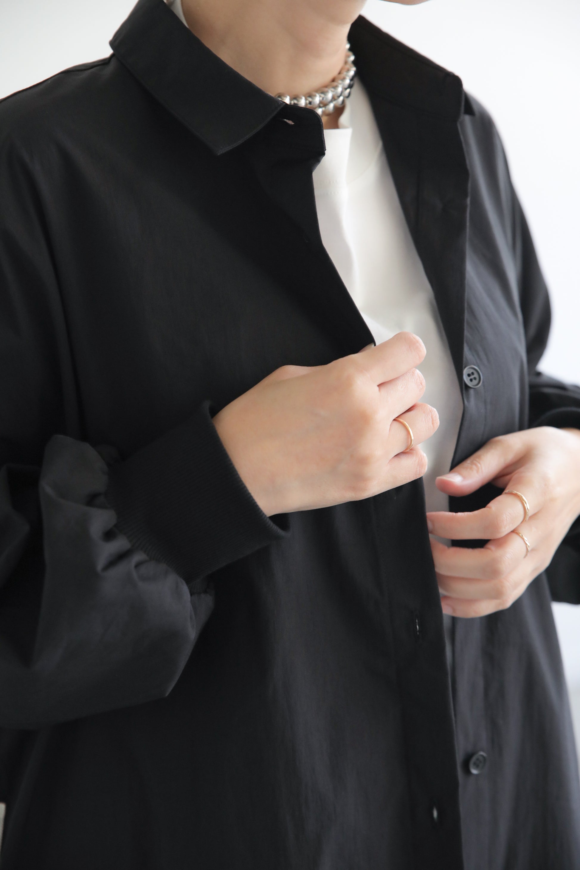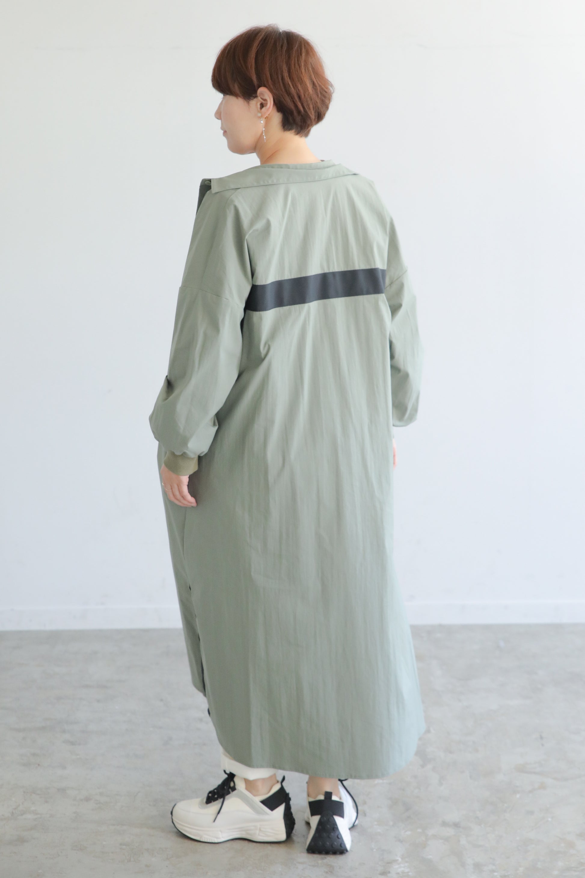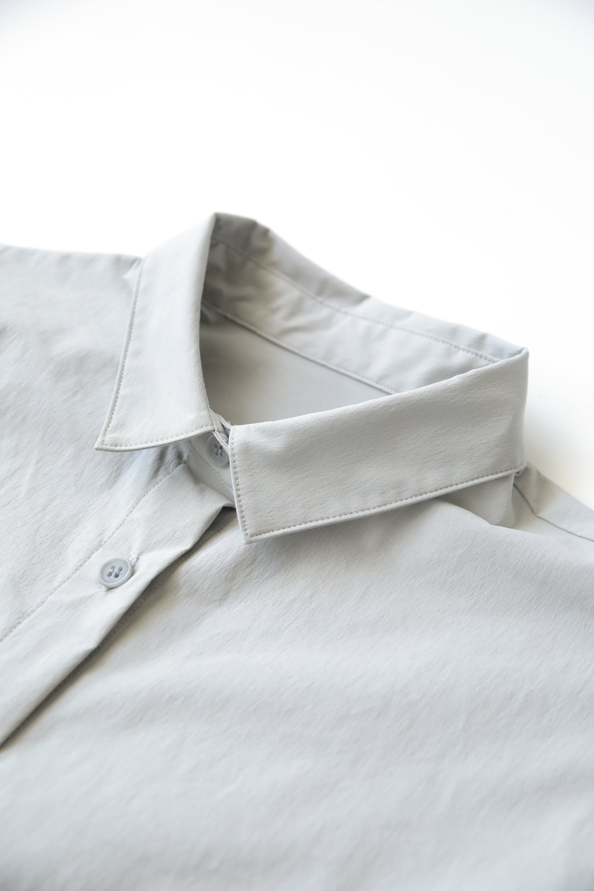 ハリのあるシャツ地に、背中のワンラインが映えるロング丈のシャツ羽織。前を開けて“羽織り”、閉じて“シャツワンピ”—2WAYでオンオフを横断。クリーンなきれいめ感に、スポーティなアクセントをひとさじ添えた主役級の一枚です。