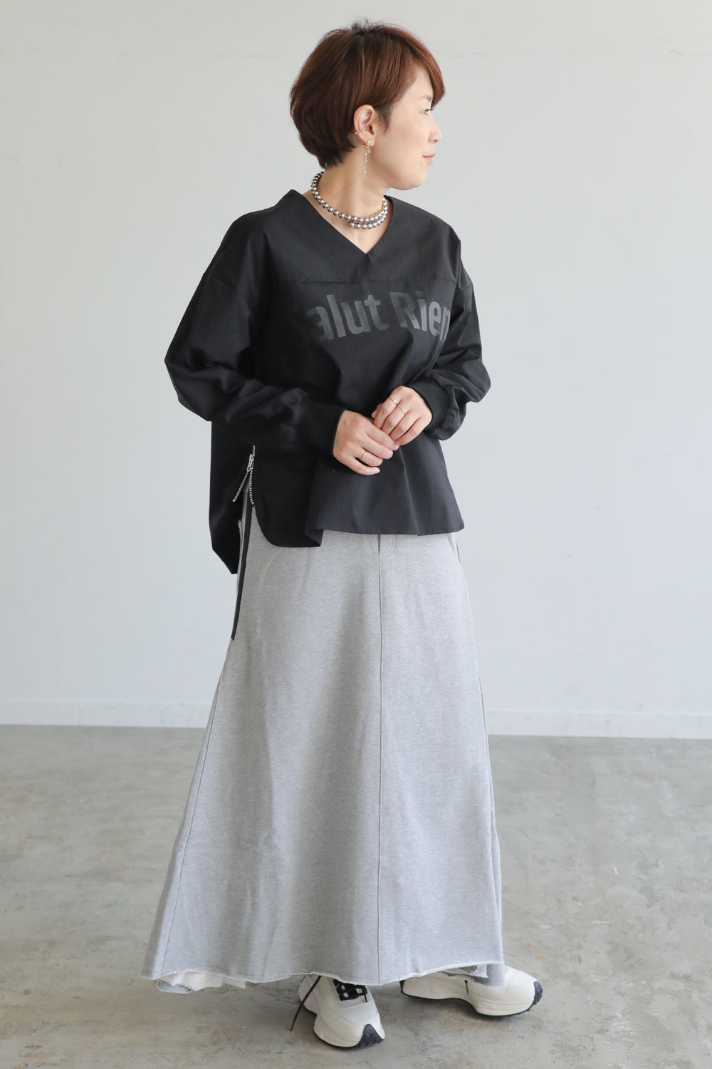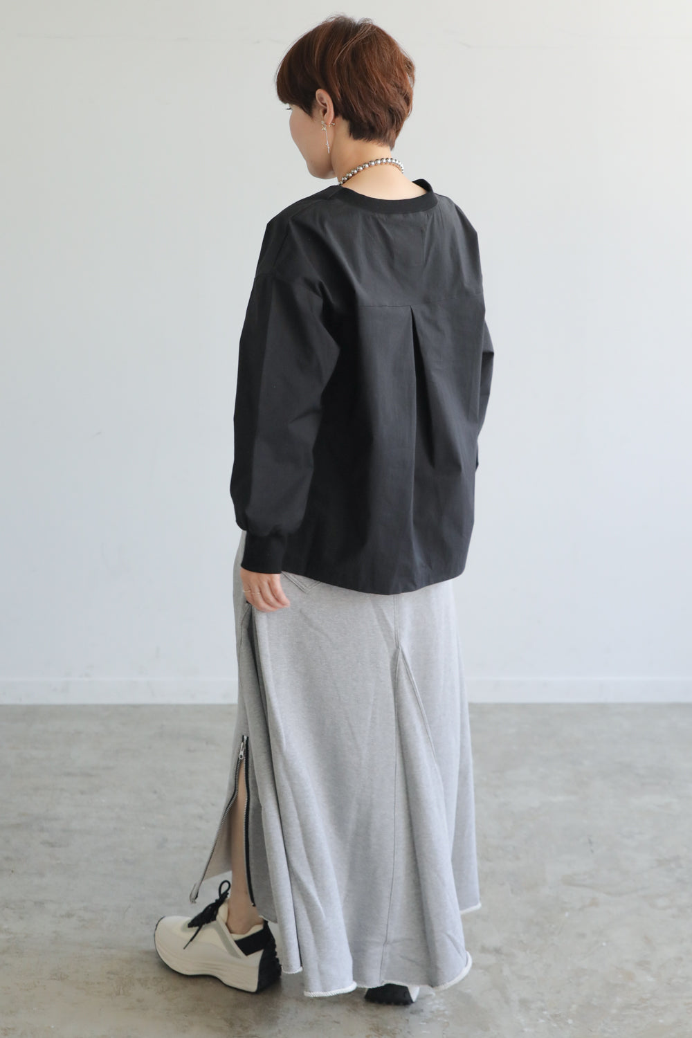 前丈57cm/後丈66cmの前後差で腰まわりをカバーしつつ軽やかな動き。身幅100cm・裄丈78cmでリラックス、袖口リブが手首をすっきり見せます。
