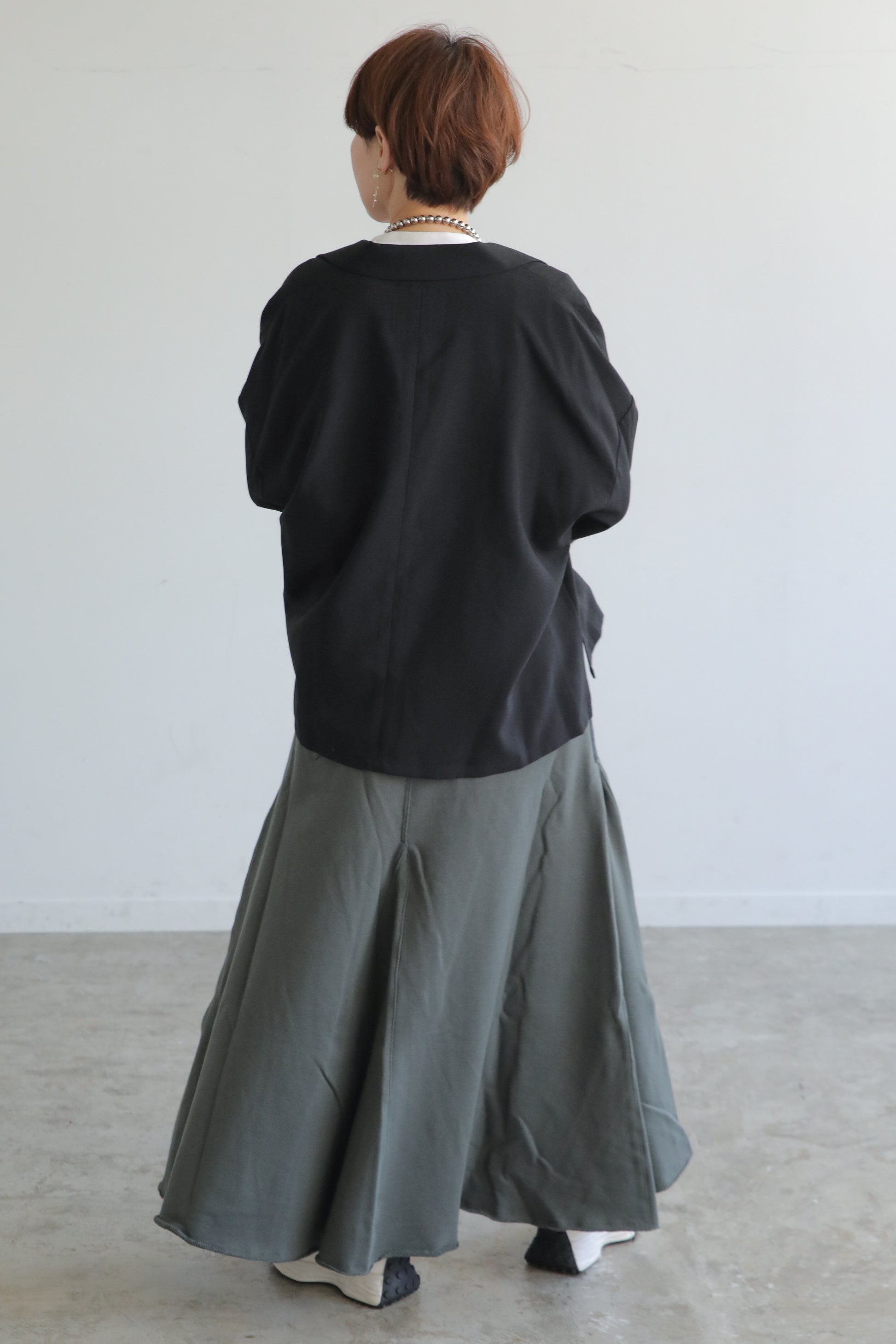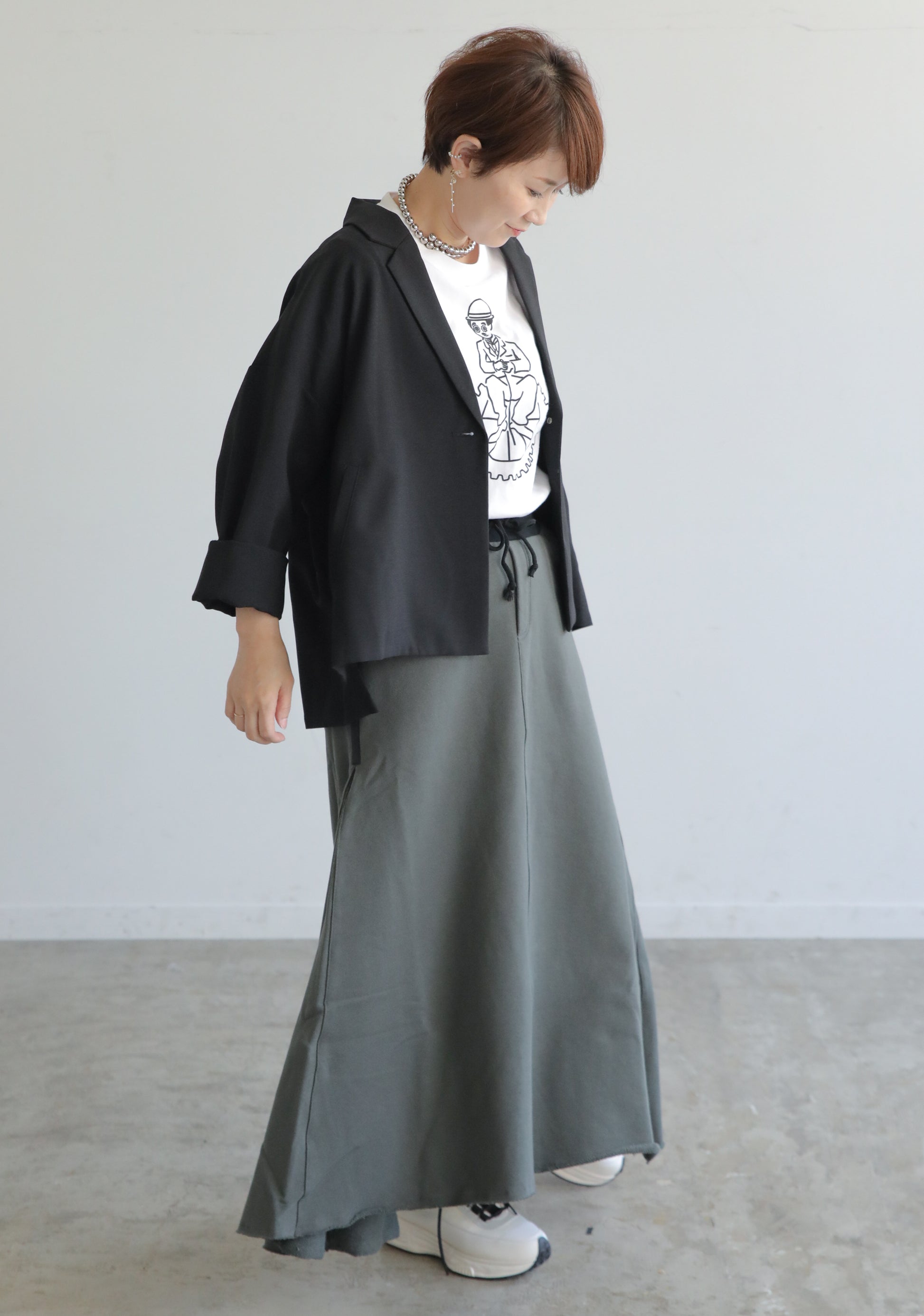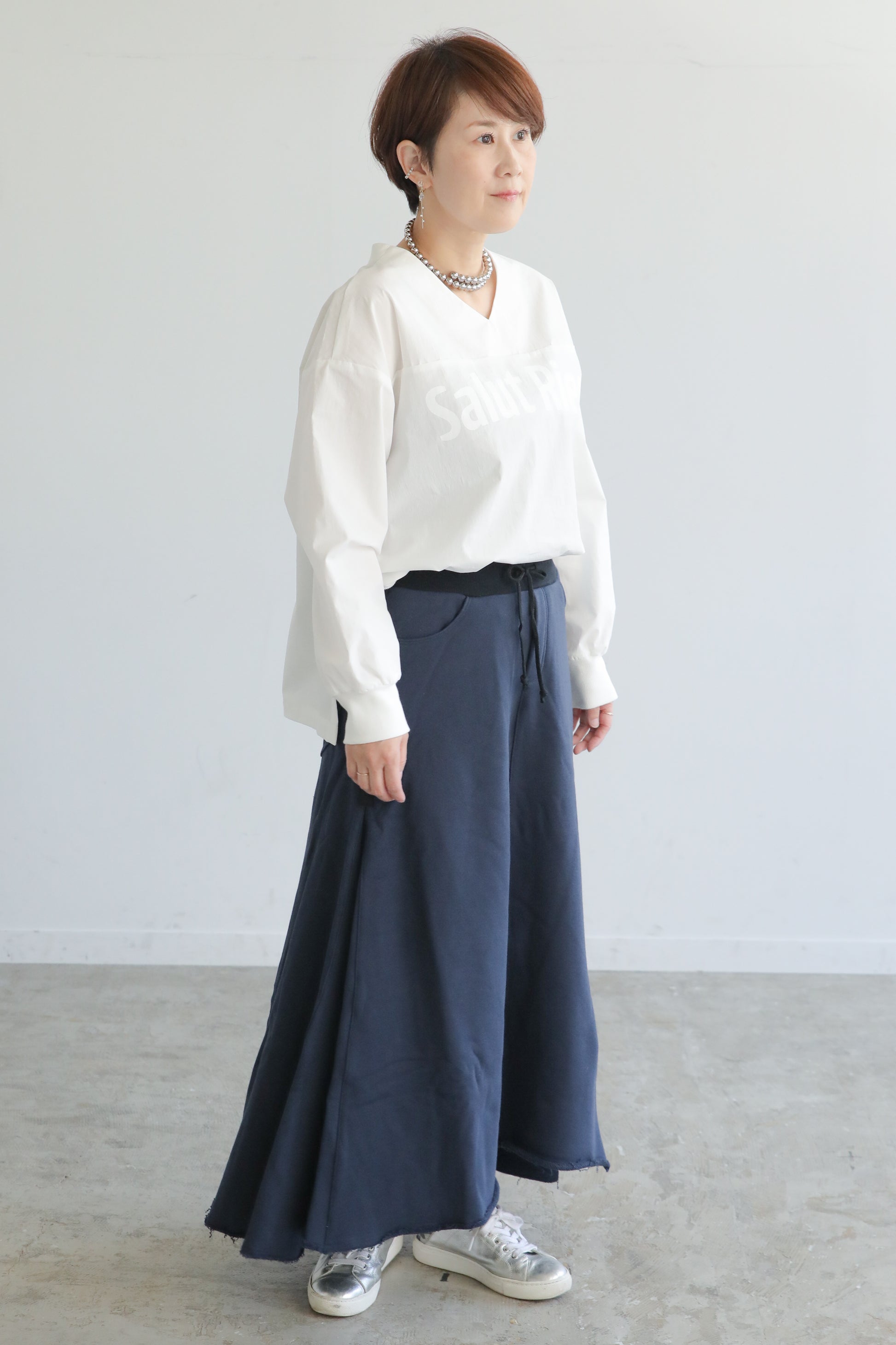 前後差のあるヘムが生むドレープと、まっすぐ落ちるシルエットで脚をすっきり。