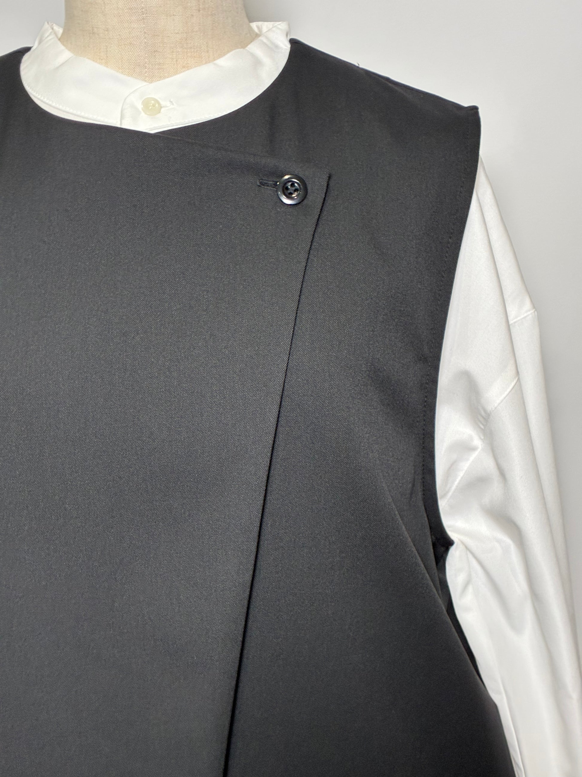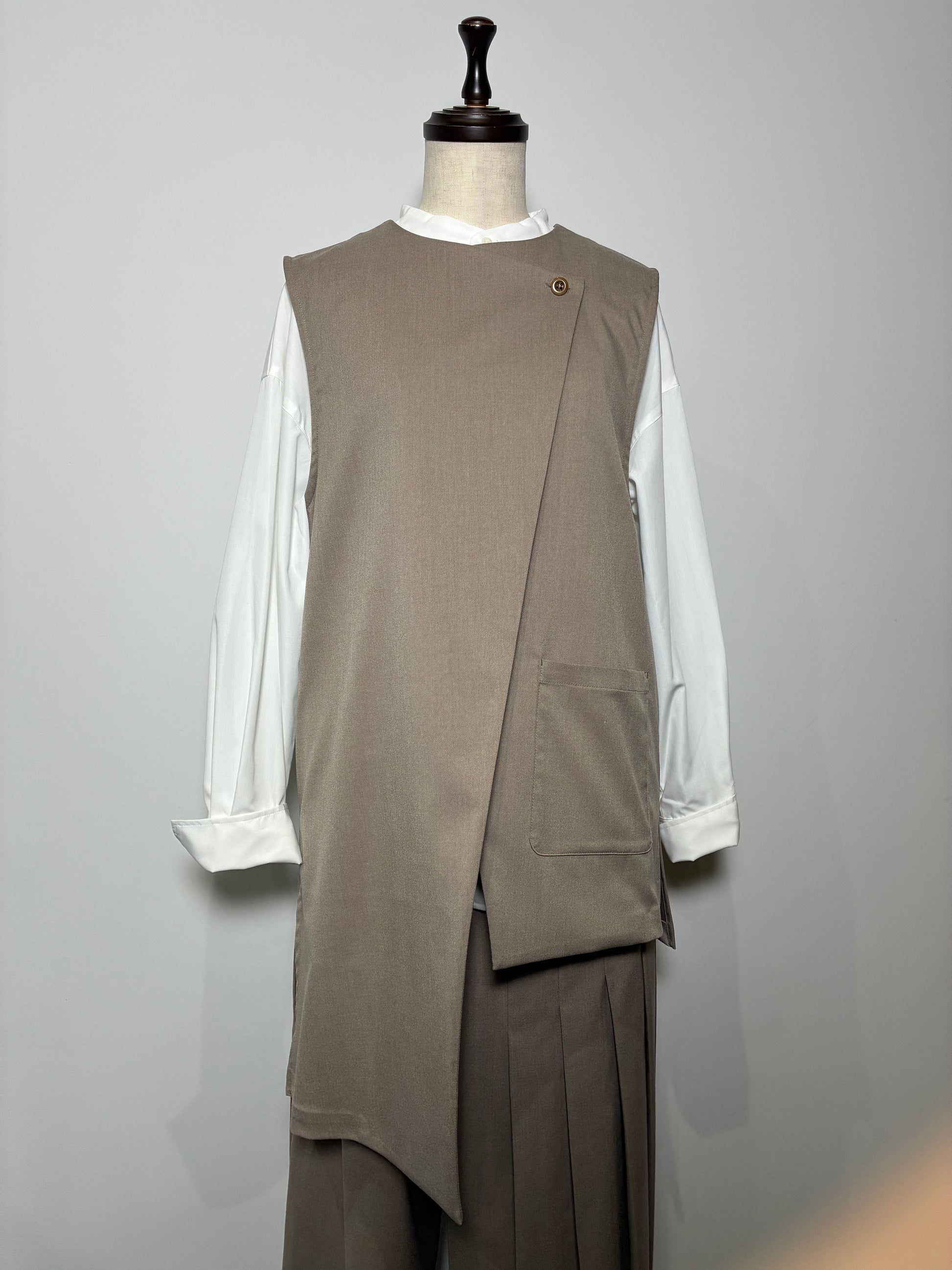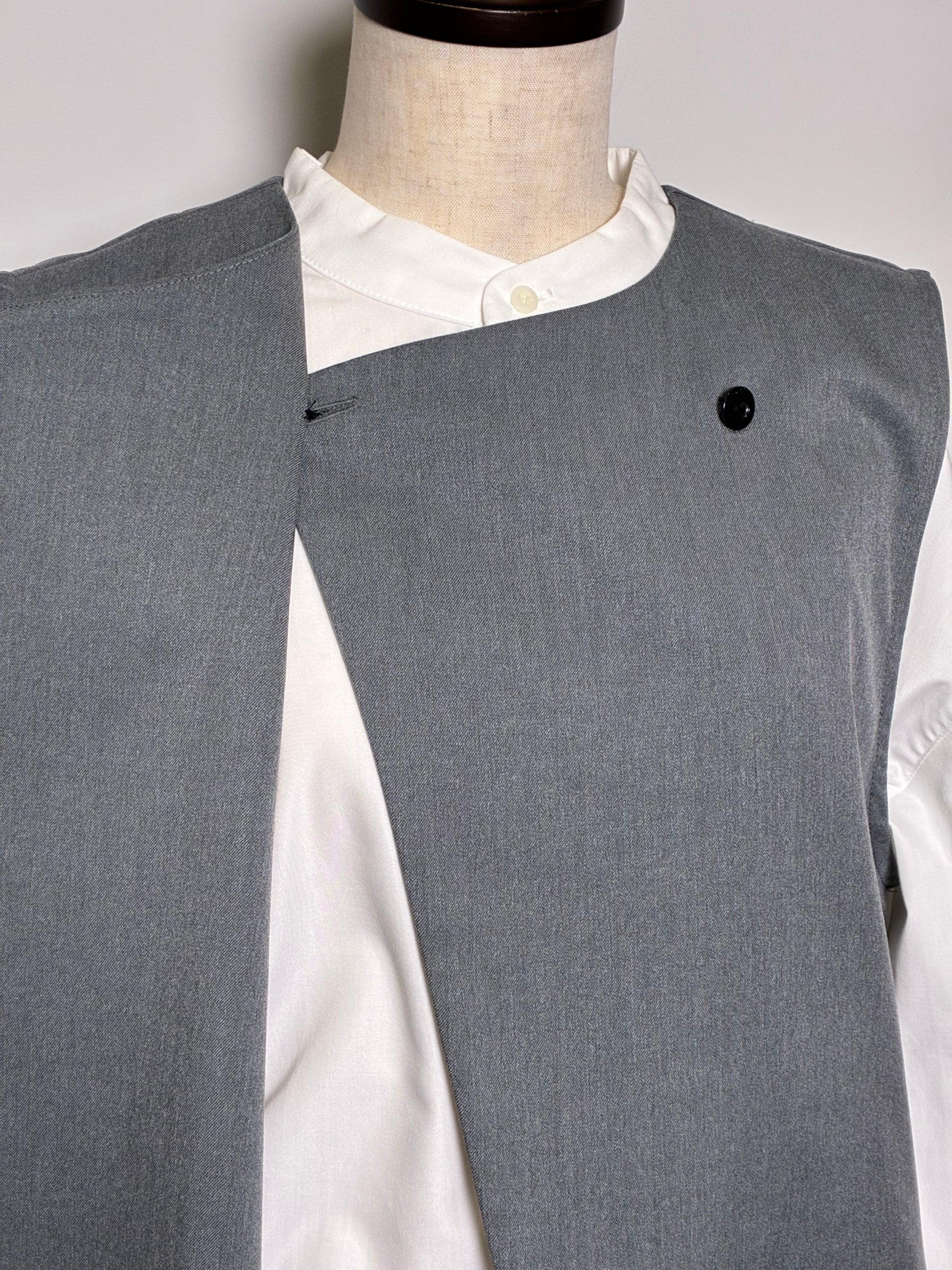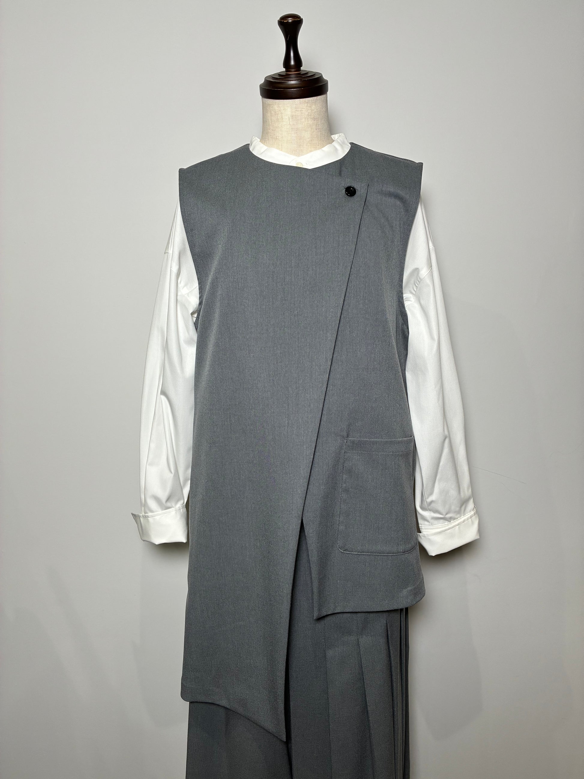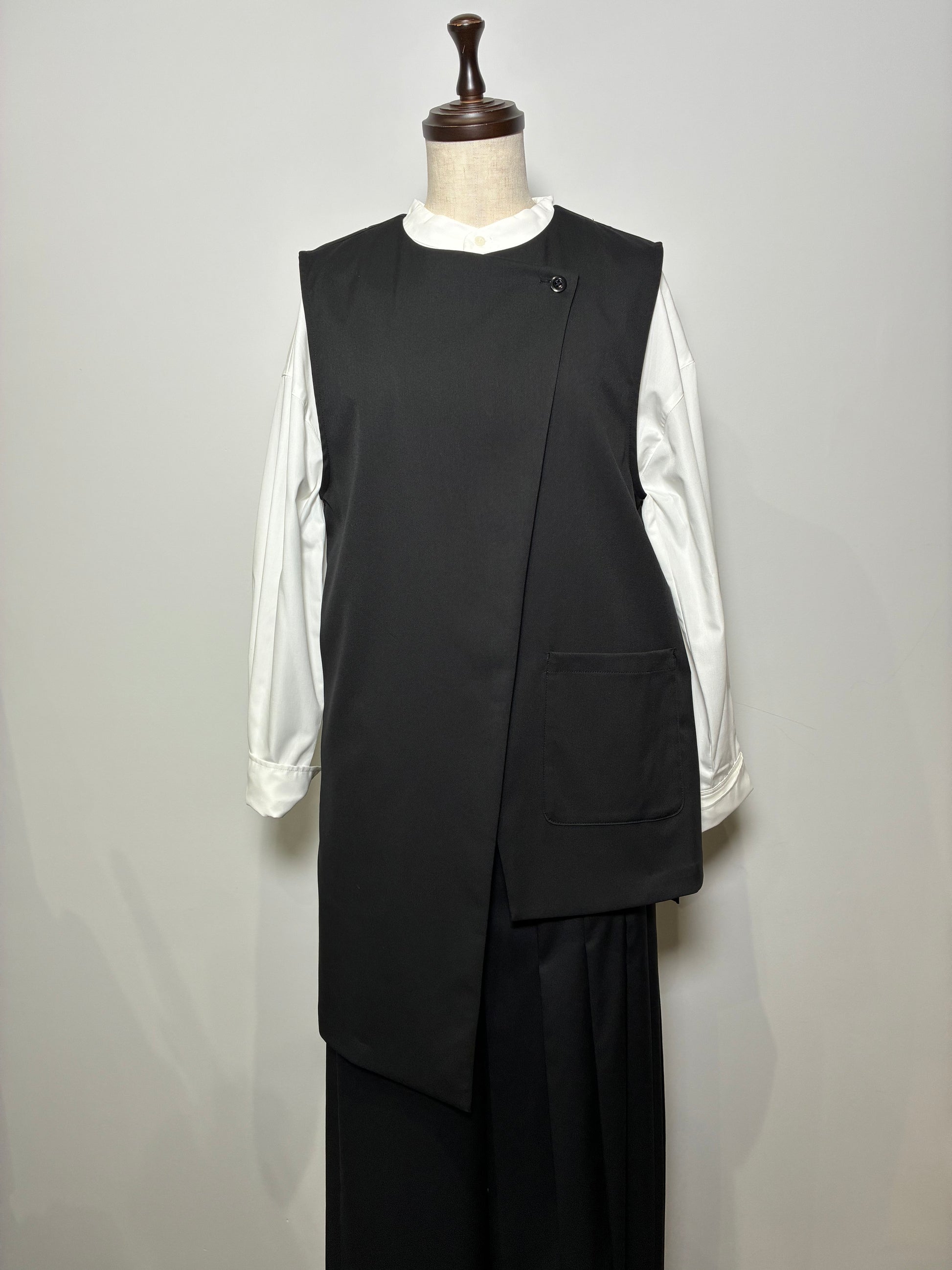 上品さの中に個性が光る、アシンメトリーデザインのジレ。