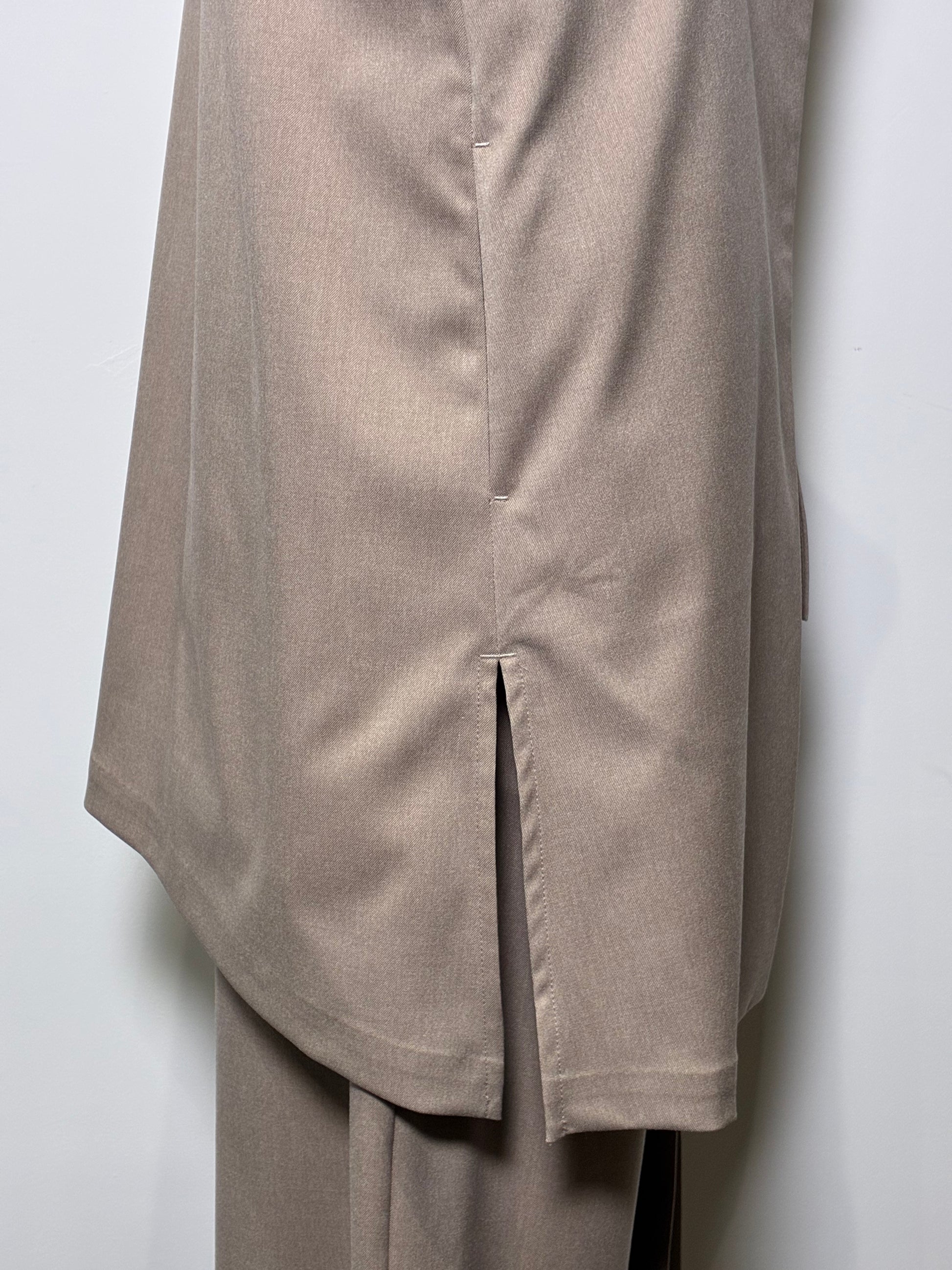 裾のアシンメトリーなカッティングが、シンプルなスタイルにモードな抜け感をプラス。