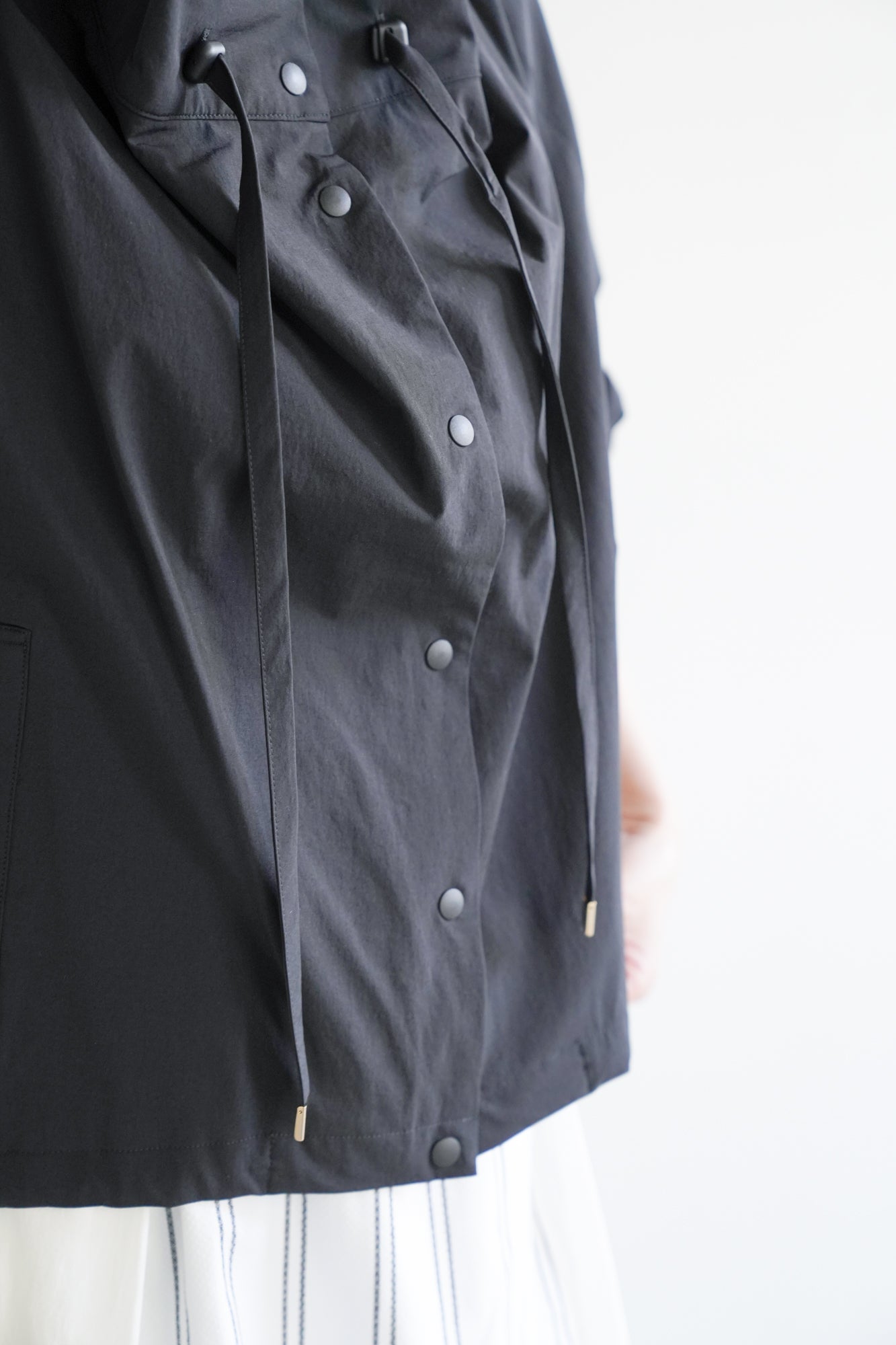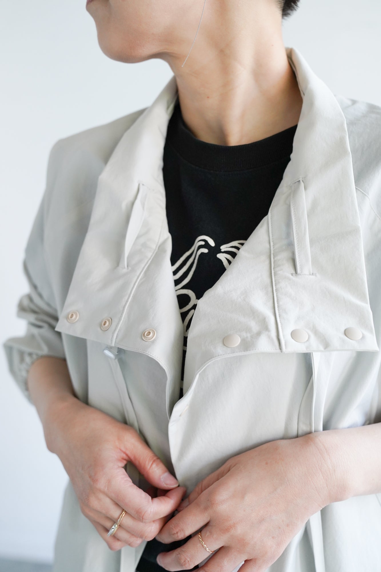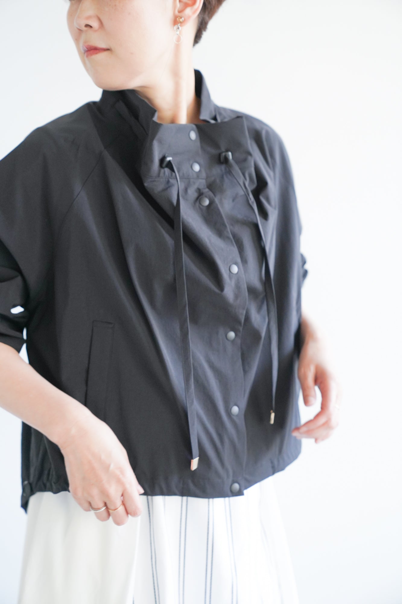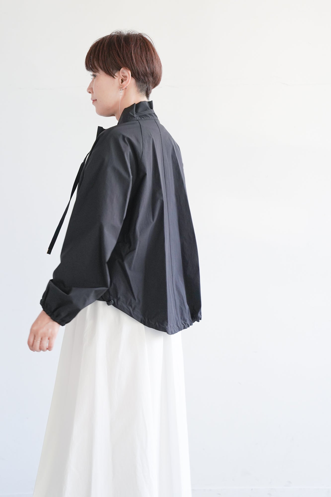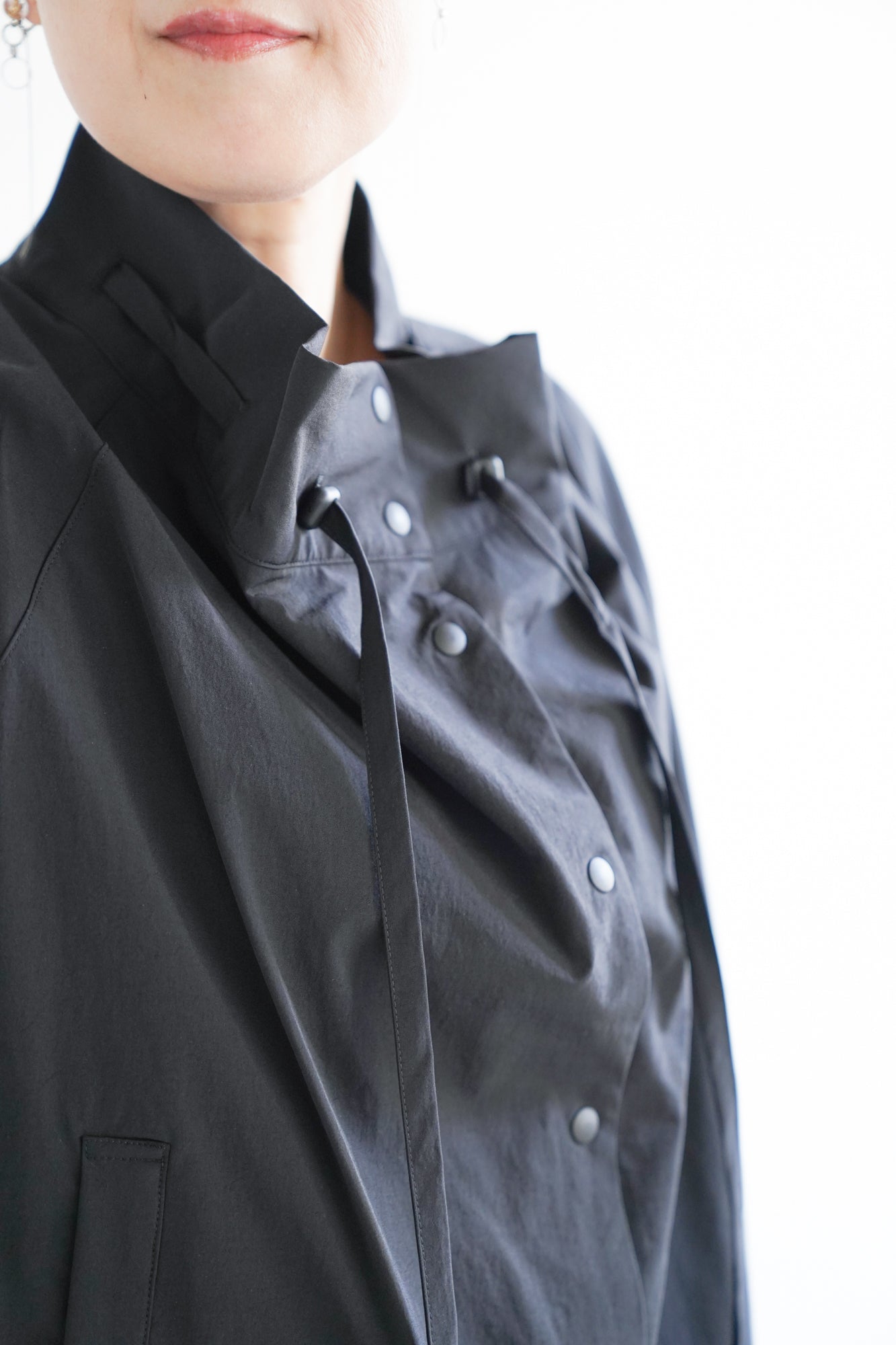最大の特徴は、首元に動きを生む変形カラーとドローストリングデザイン。