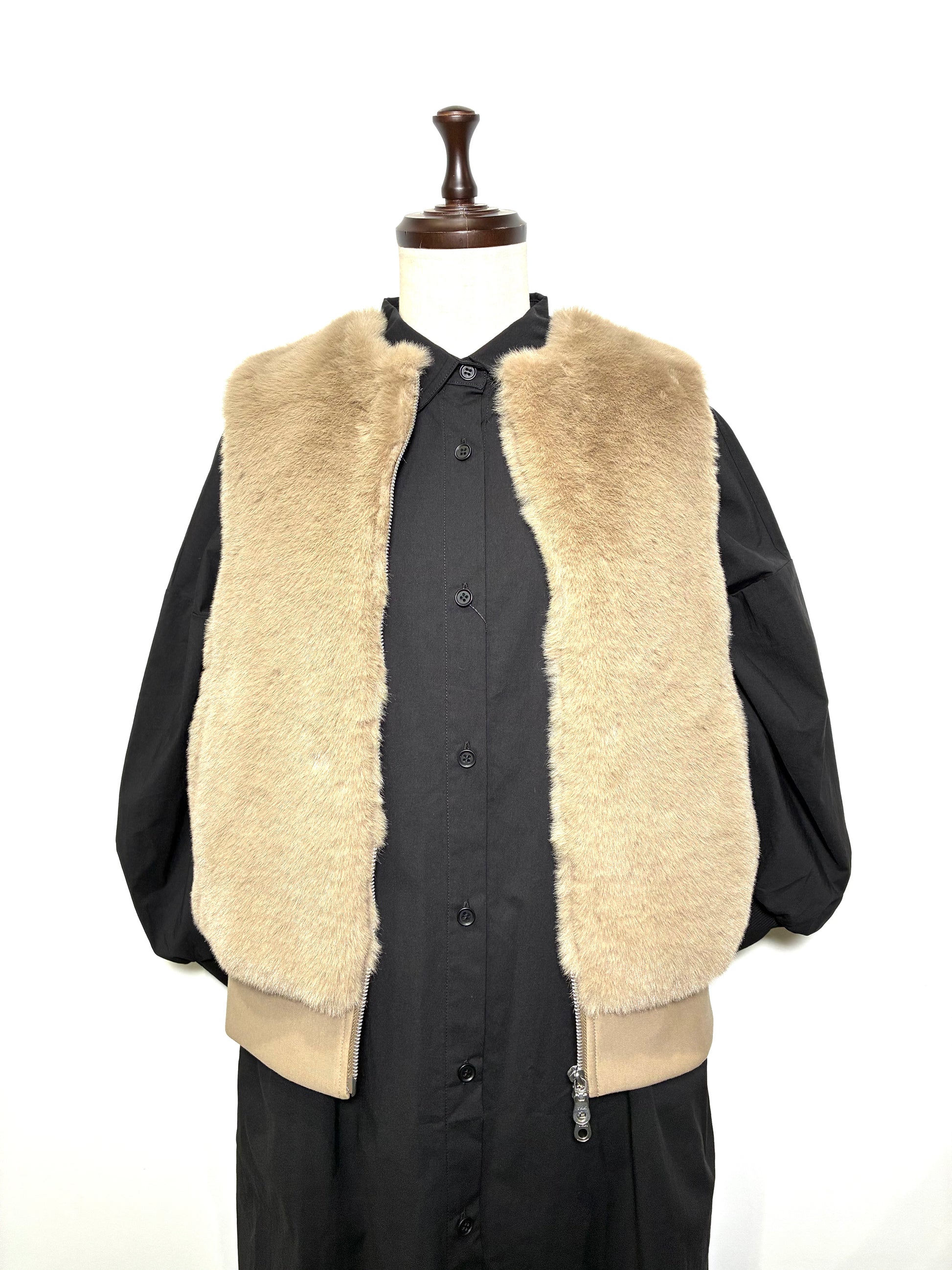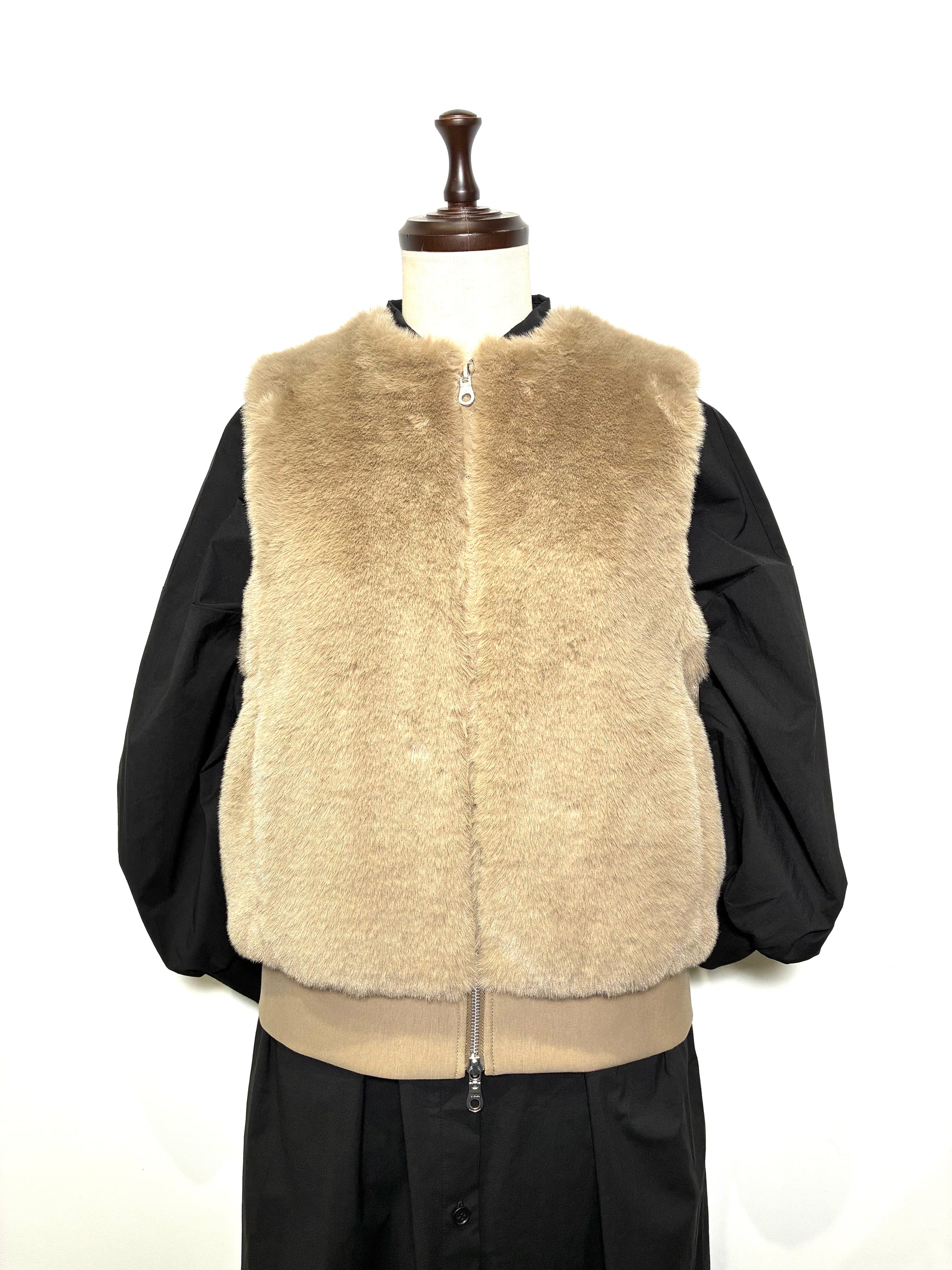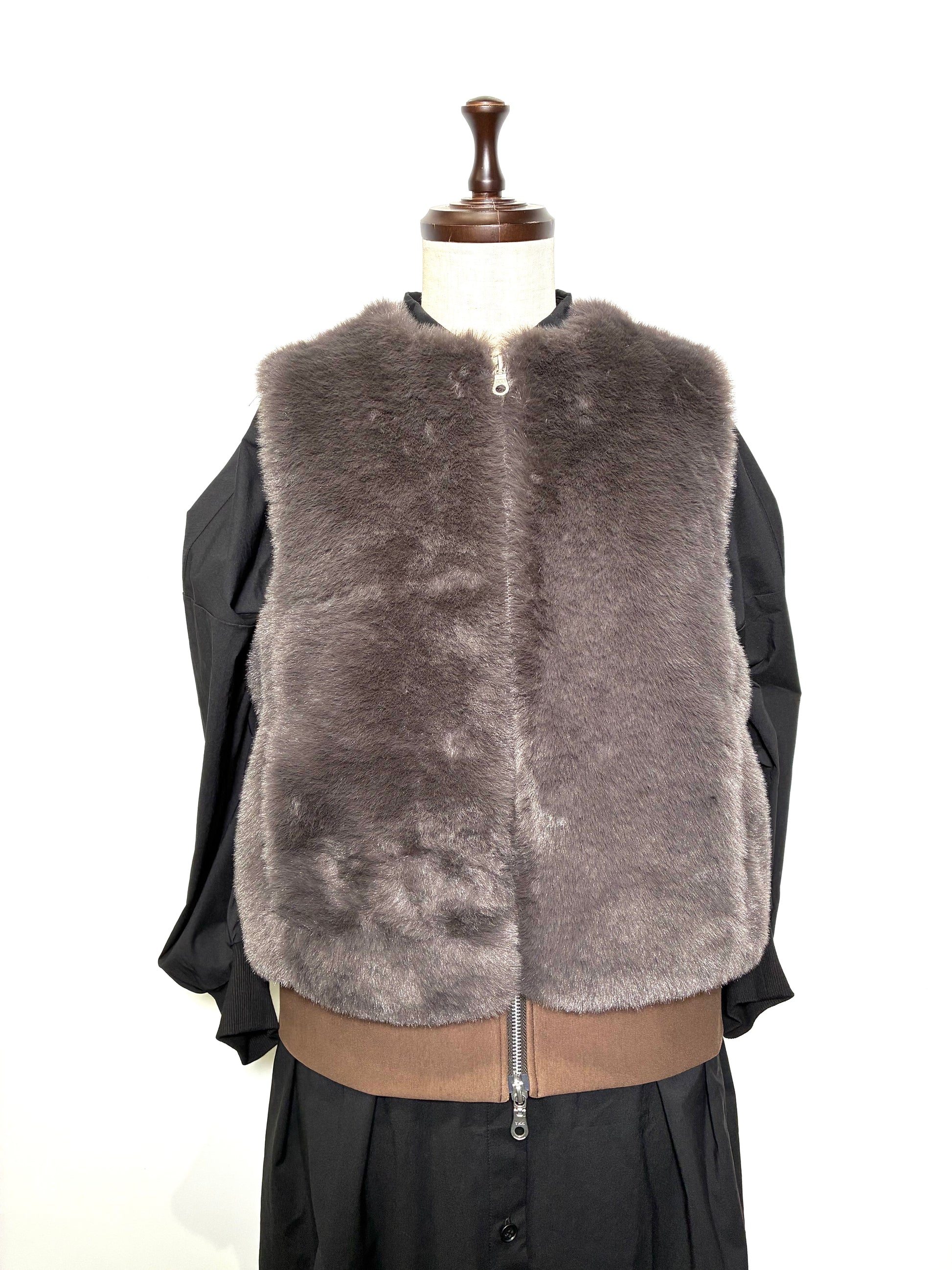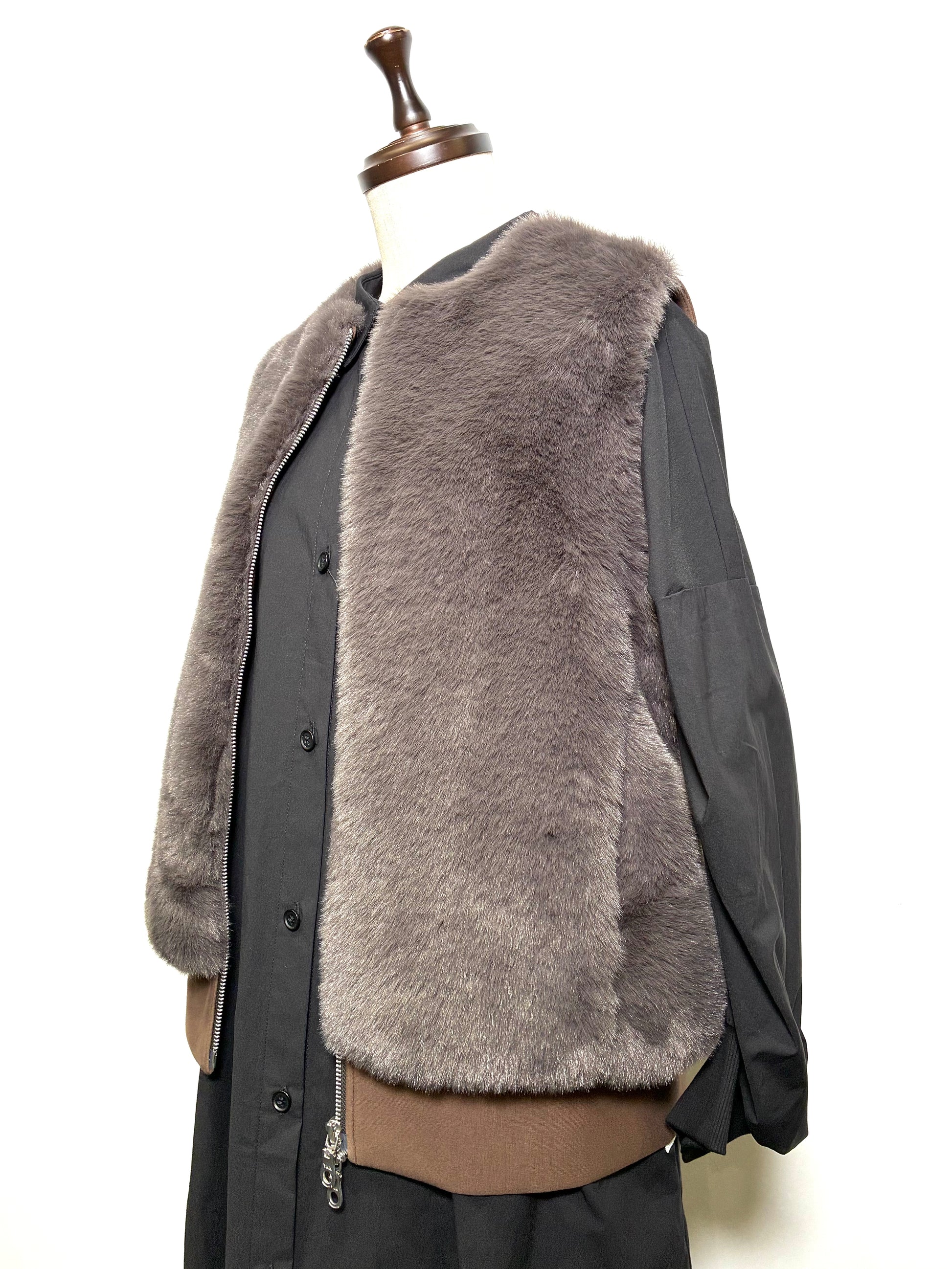 前身頃は、なめらかで艶のあるフェイクファー。後ろ身頃はマットな質感のカットソー地で切り替え、甘さを抑えた、落ち着いた雰囲気に仕上げています。厚みを抑えたコンパクトなシルエットは、コートの中にもすっきりと収まり、秋口から真冬、春先まで長く活躍。ダブルジップ仕様なので、その日の気分で開き具合を変えて楽しめます。