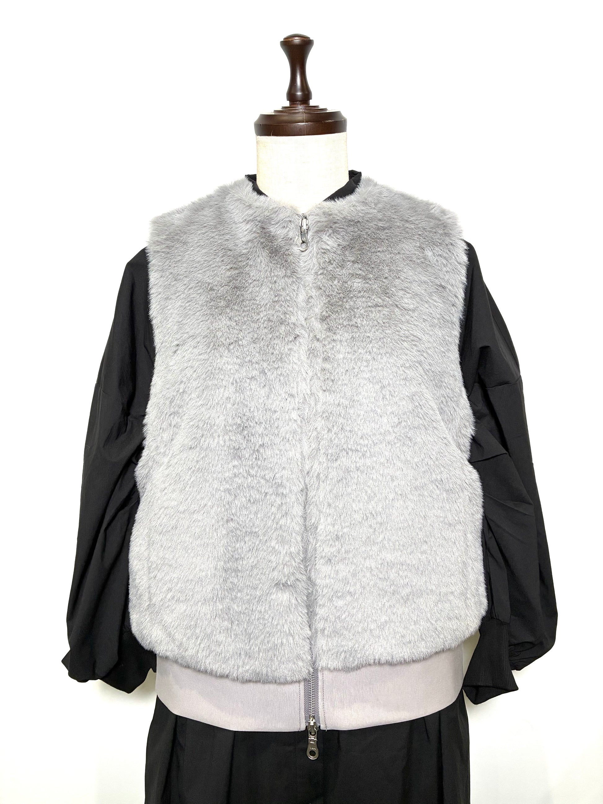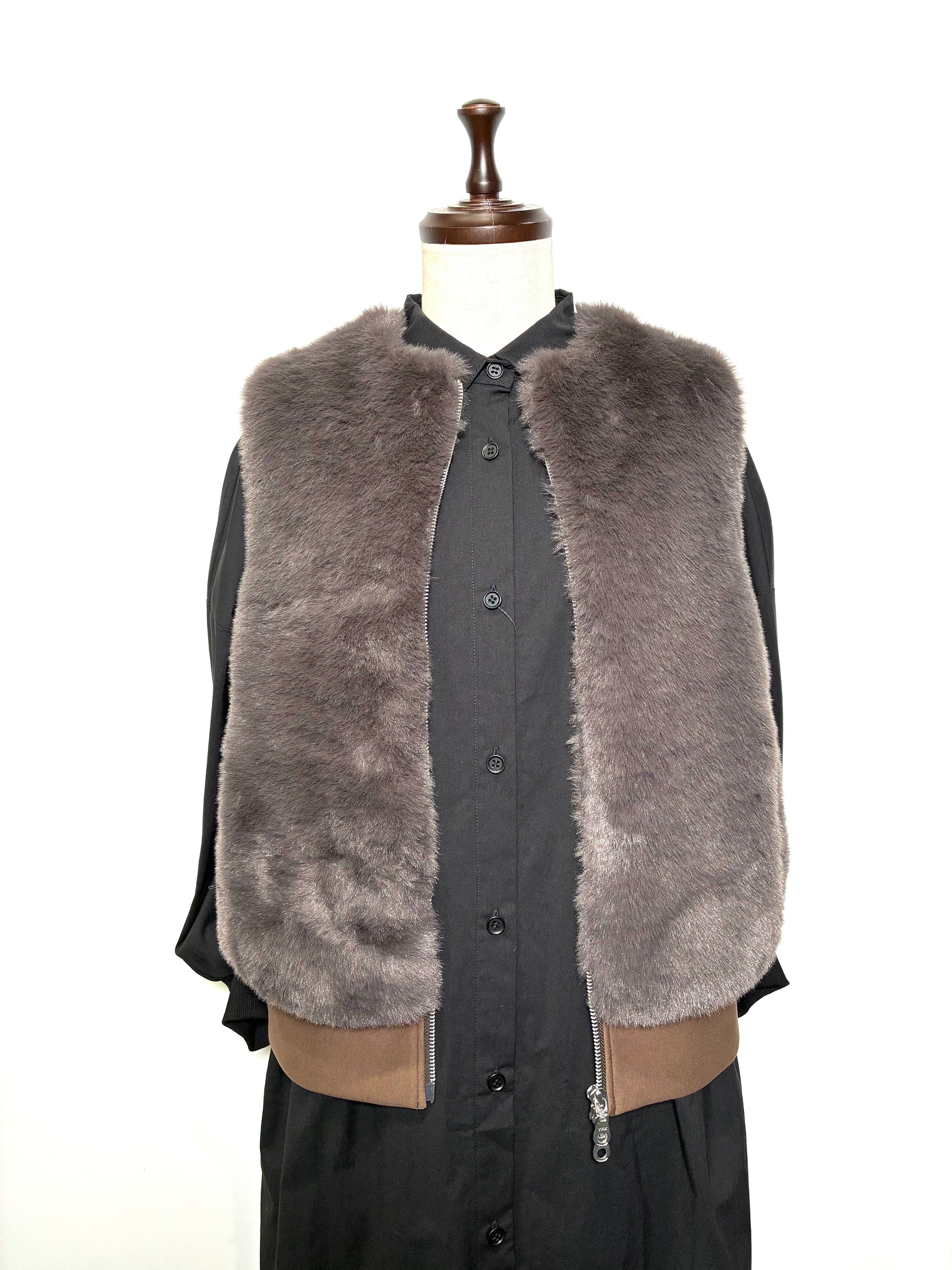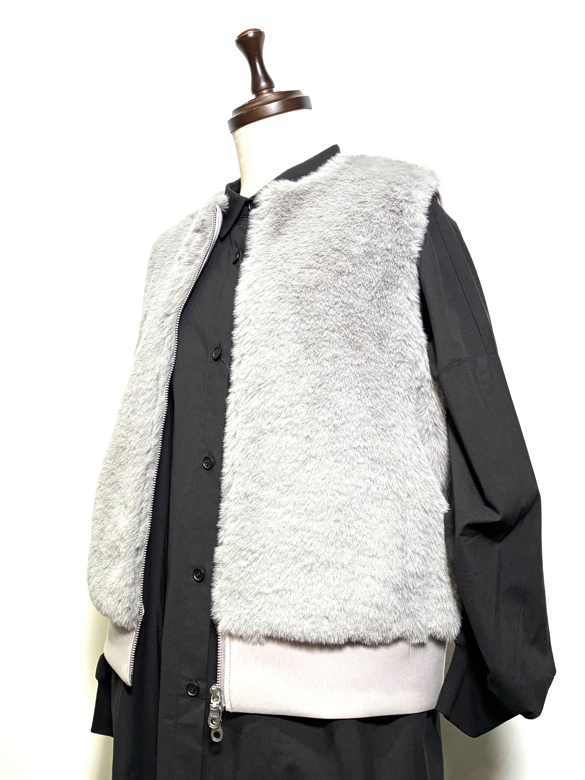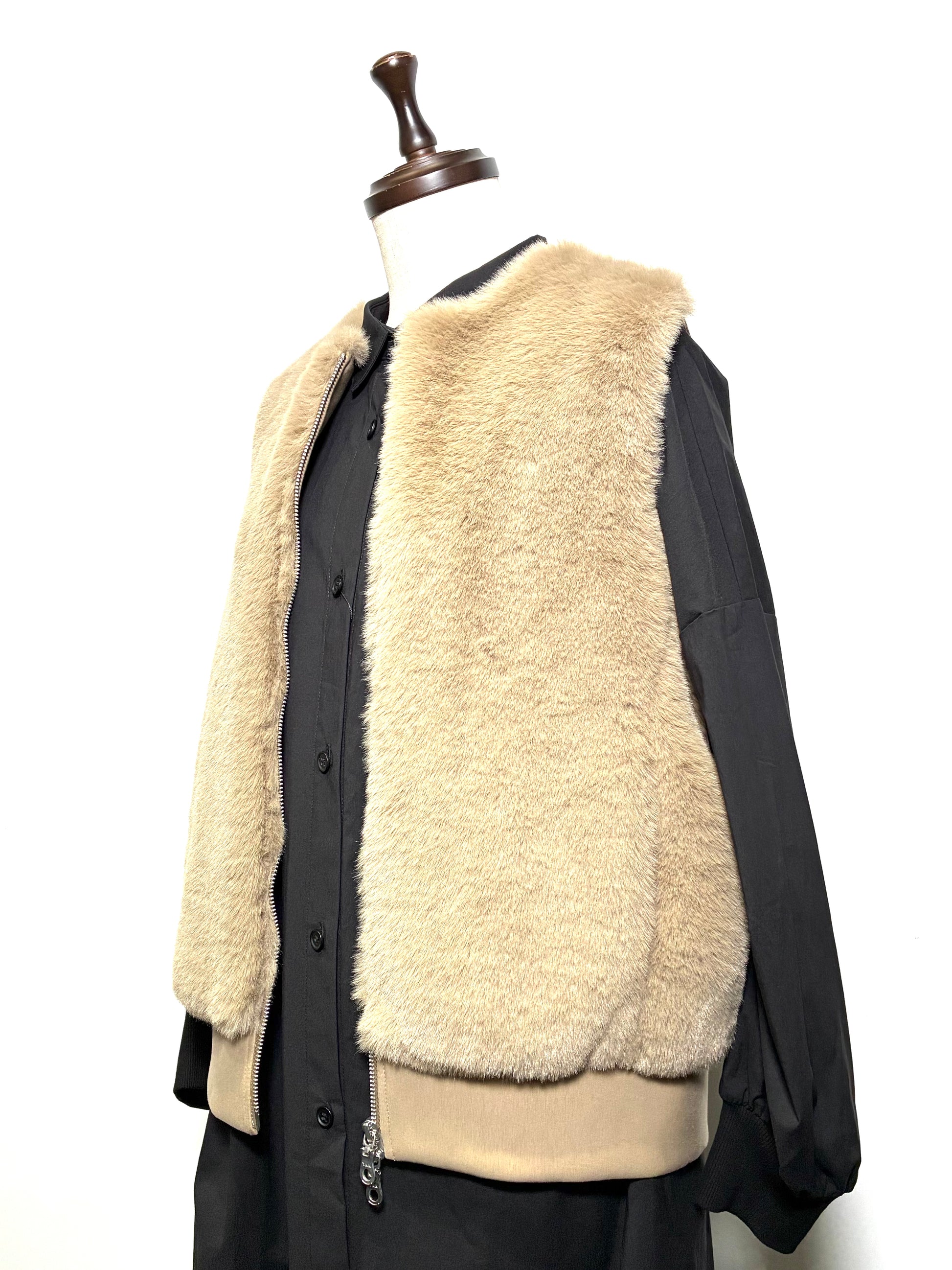 前身頃は、なめらかで艶のあるフェイクファー。後ろ身頃はマットな質感のカットソー地で切り替え、甘さを抑えた、落ち着いた雰囲気に仕上げています。厚みを抑えたコンパクトなシルエットは、コートの中にもすっきりと収まり、秋口から真冬、春先まで長く活躍。ダブルジップ仕様なので、その日の気分で開き具合を変えて楽しめます。