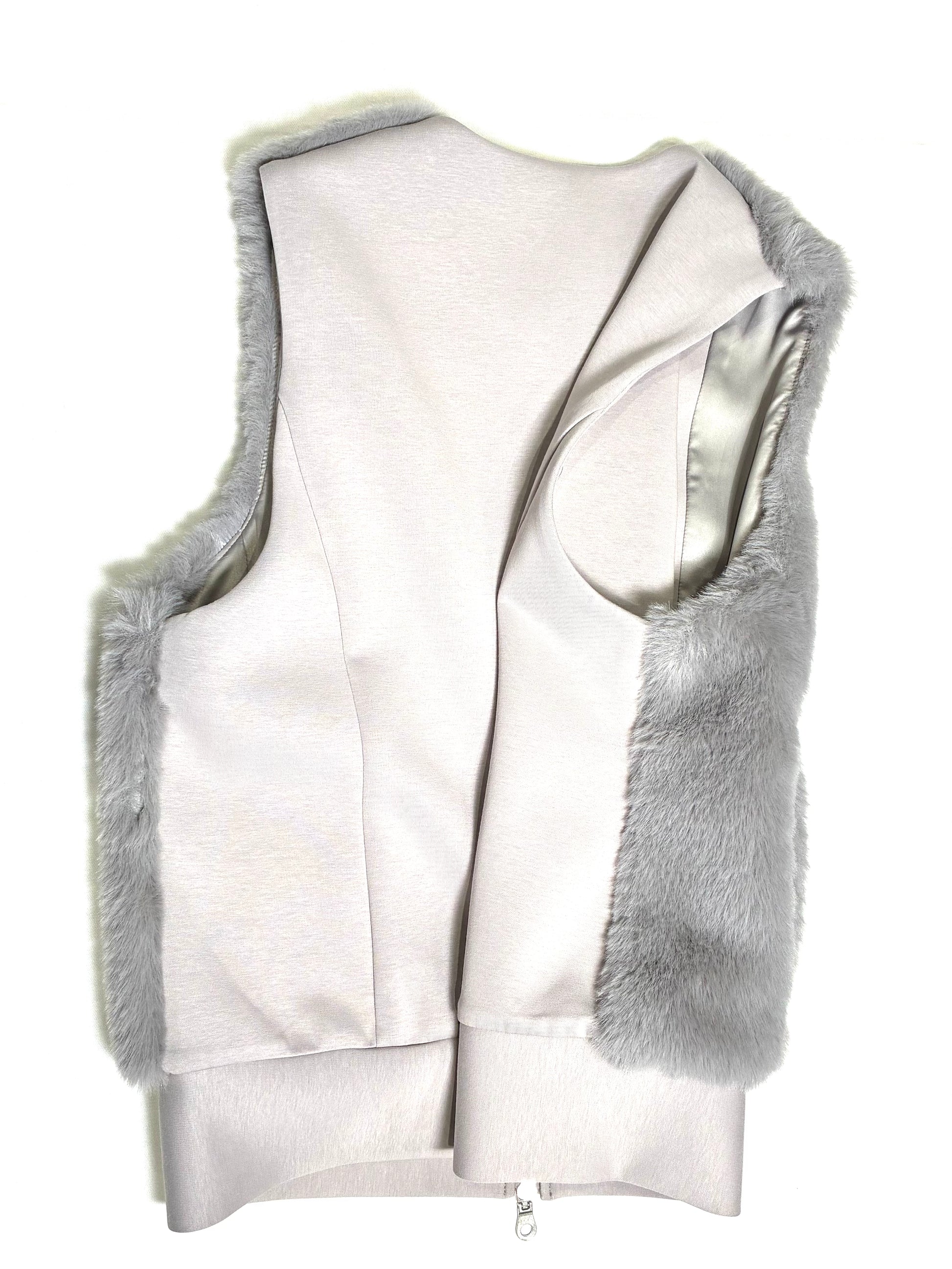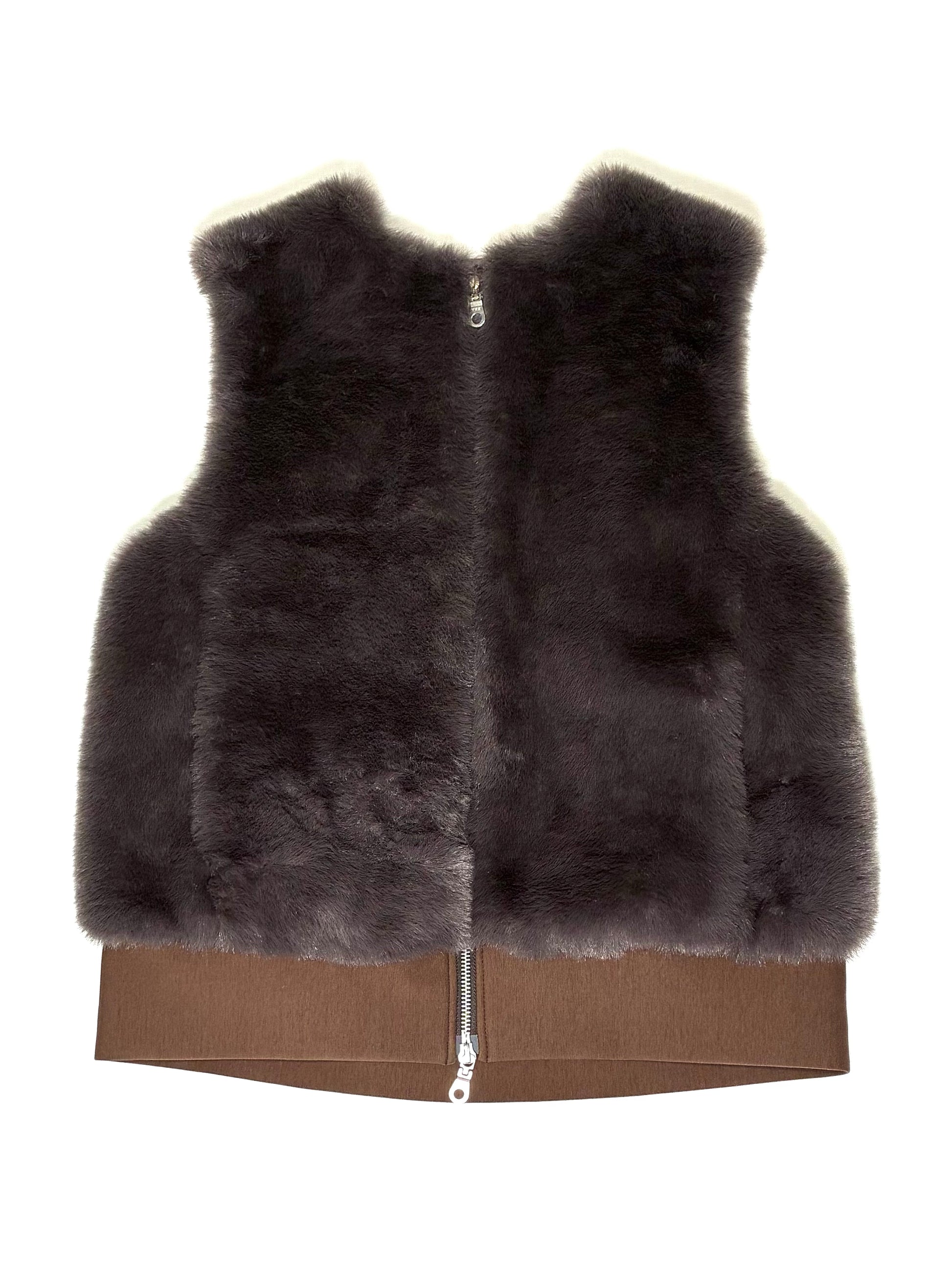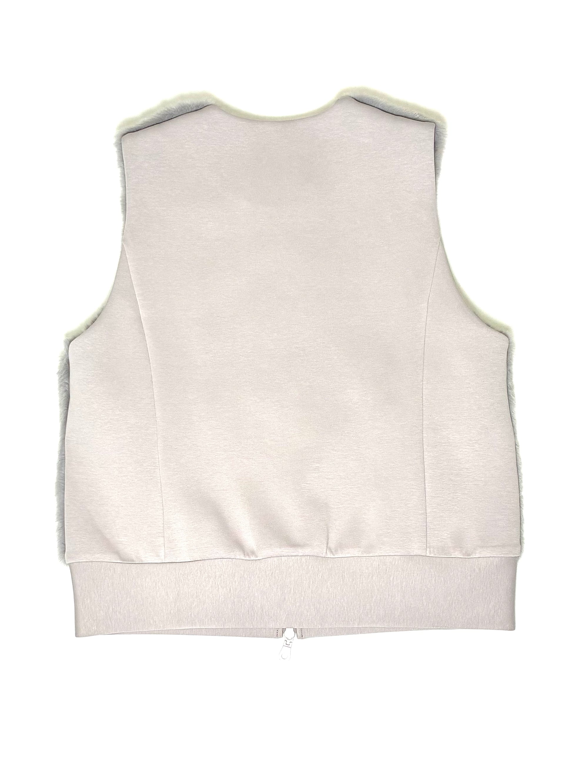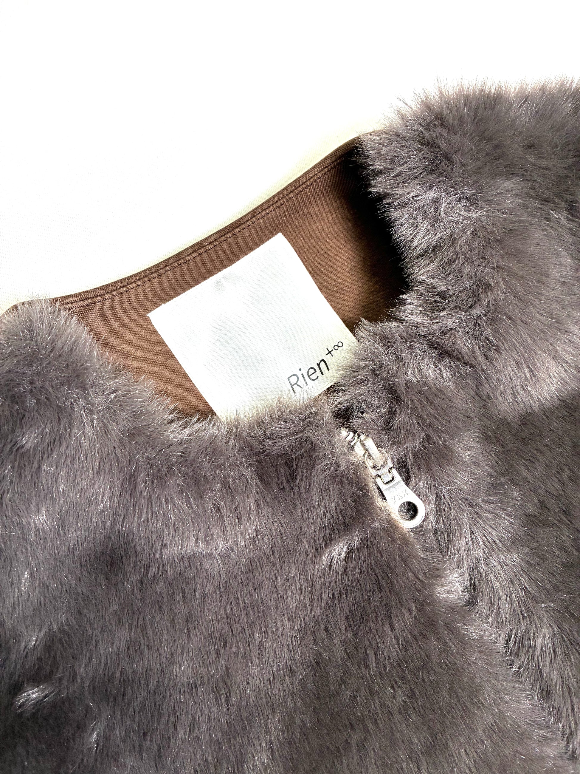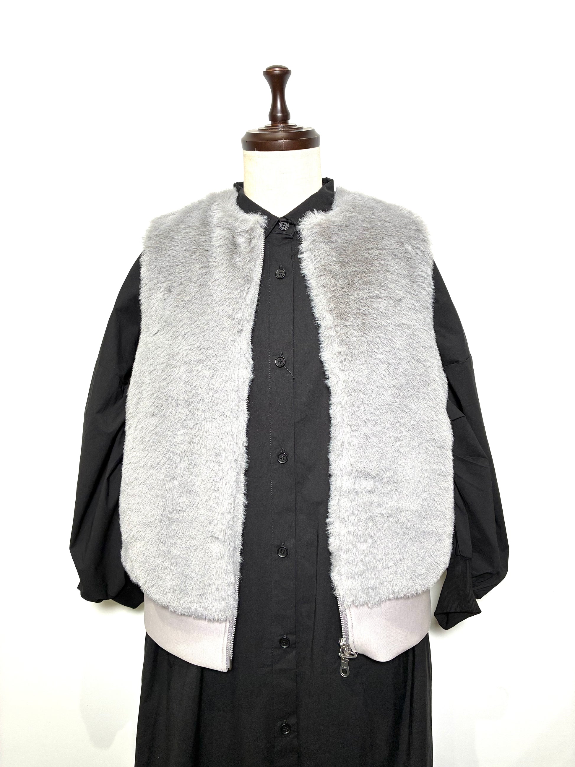 前身頃は、なめらかで艶のあるフェイクファー。後ろ身頃はマットな質感のカットソー地で切り替え、甘さを抑えた、落ち着いた雰囲気に仕上げています。厚みを抑えたコンパクトなシルエットは、コートの中にもすっきりと収まり、秋口から真冬、春先まで長く活躍。ダブルジップ仕様なので、その日の気分で開き具合を変えて楽しめます。