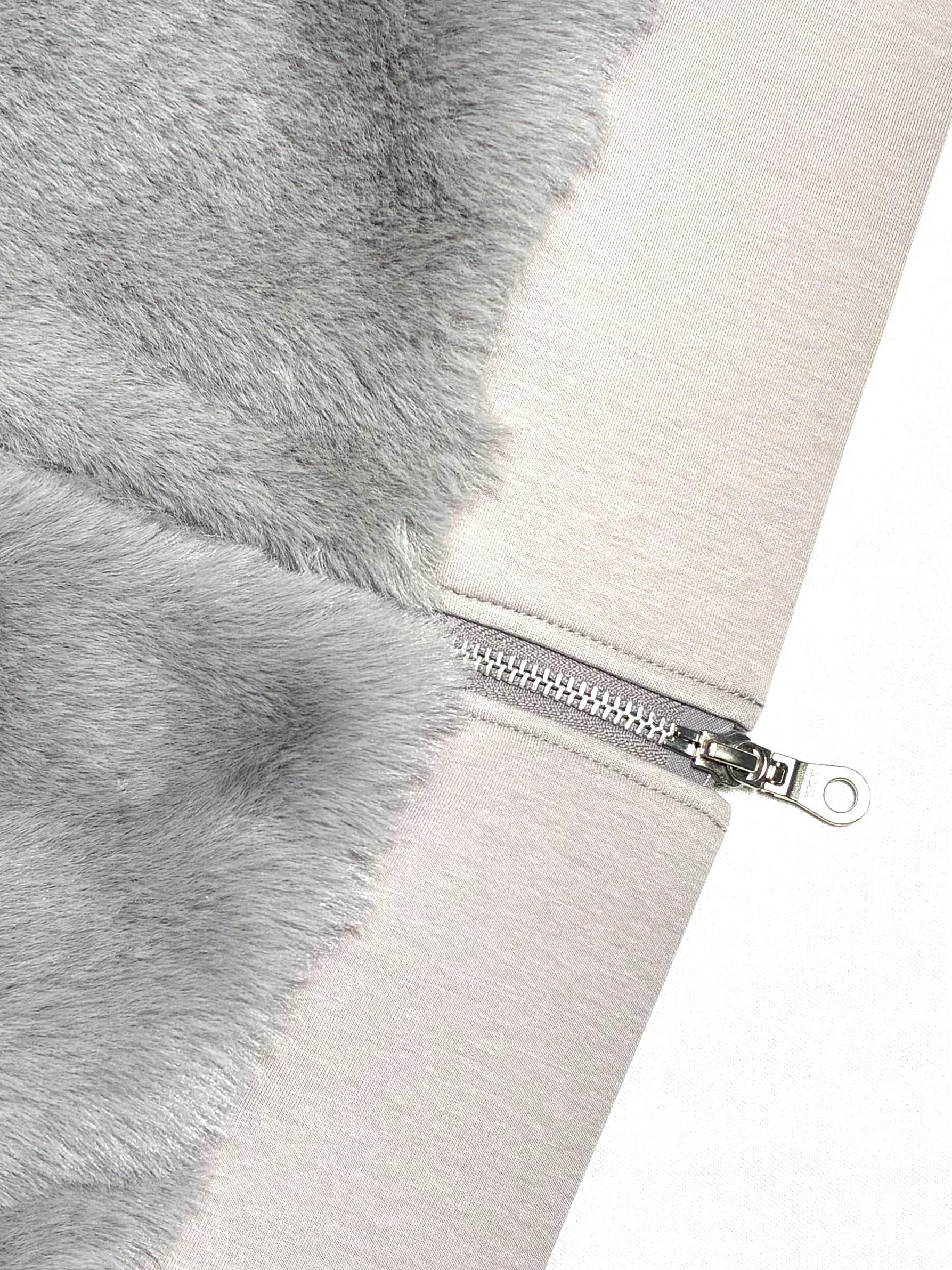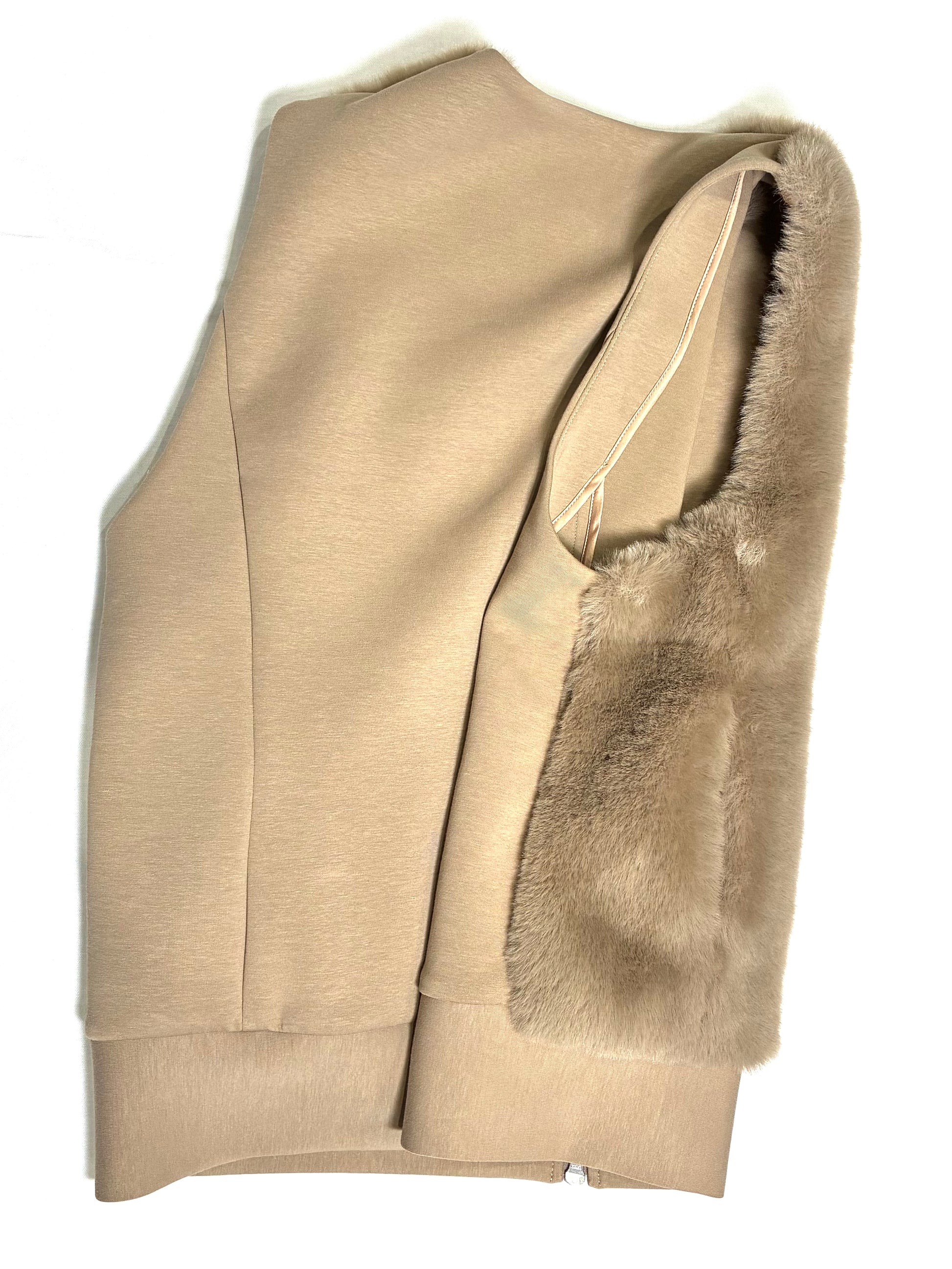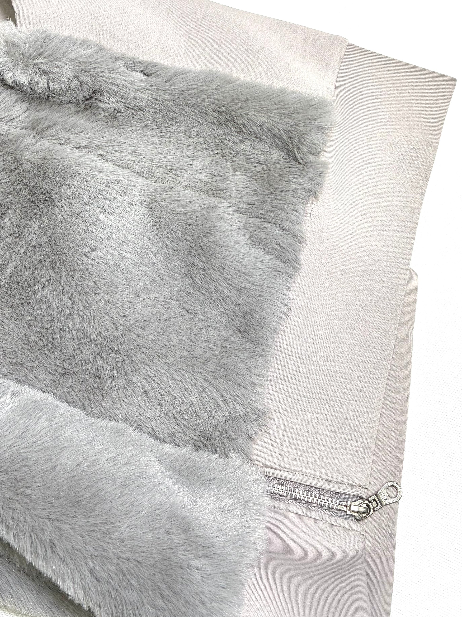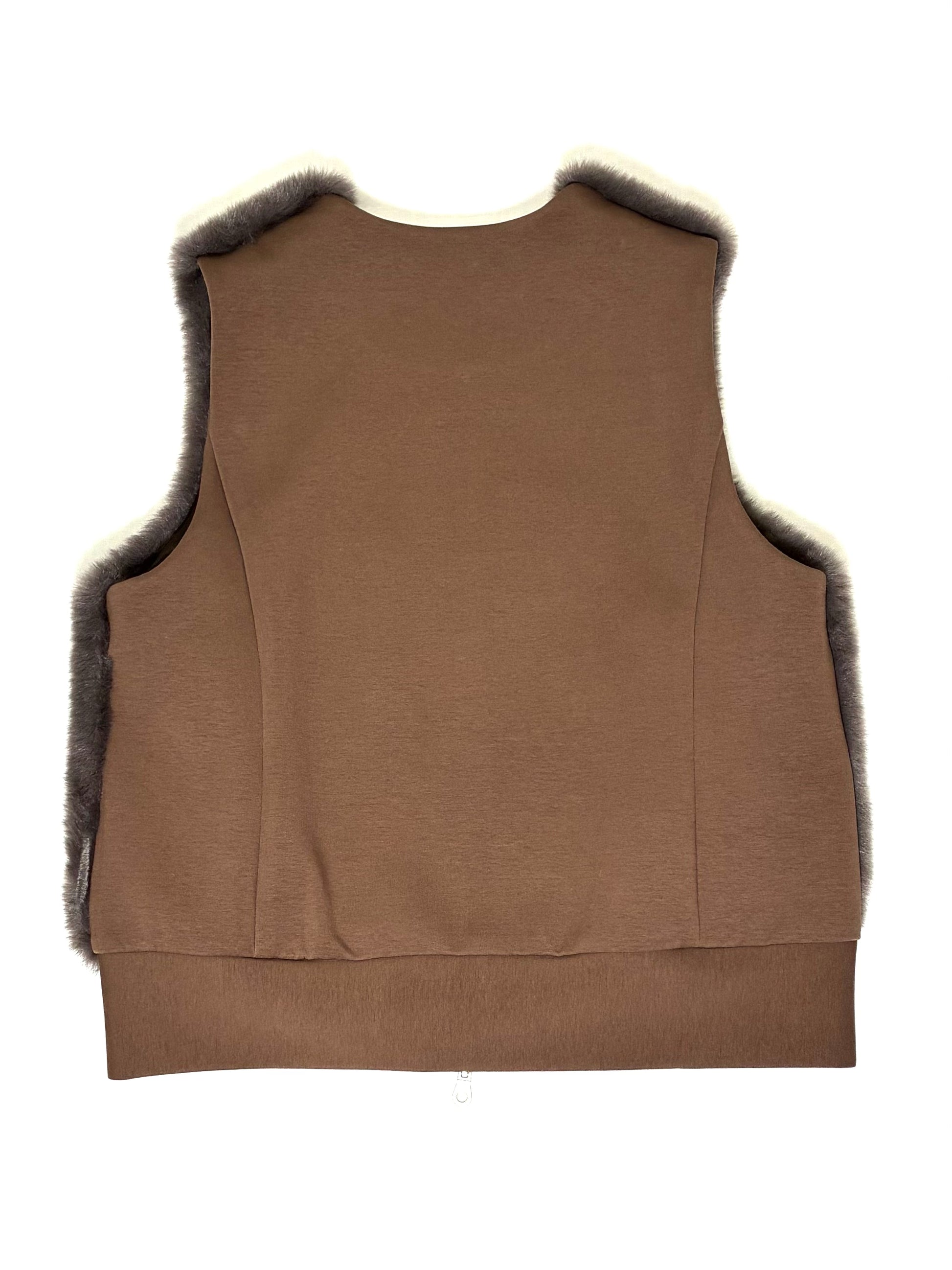 前身頃は、なめらかで艶のあるフェイクファー。後ろ身頃はマットな質感のカットソー地で切り替え、甘さを抑えた、落ち着いた雰囲気に仕上げています。厚みを抑えたコンパクトなシルエットは、コートの中にもすっきりと収まり、秋口から真冬、春先まで長く活躍。ダブルジップ仕様なので、その日の気分で開き具合を変えて楽しめます。