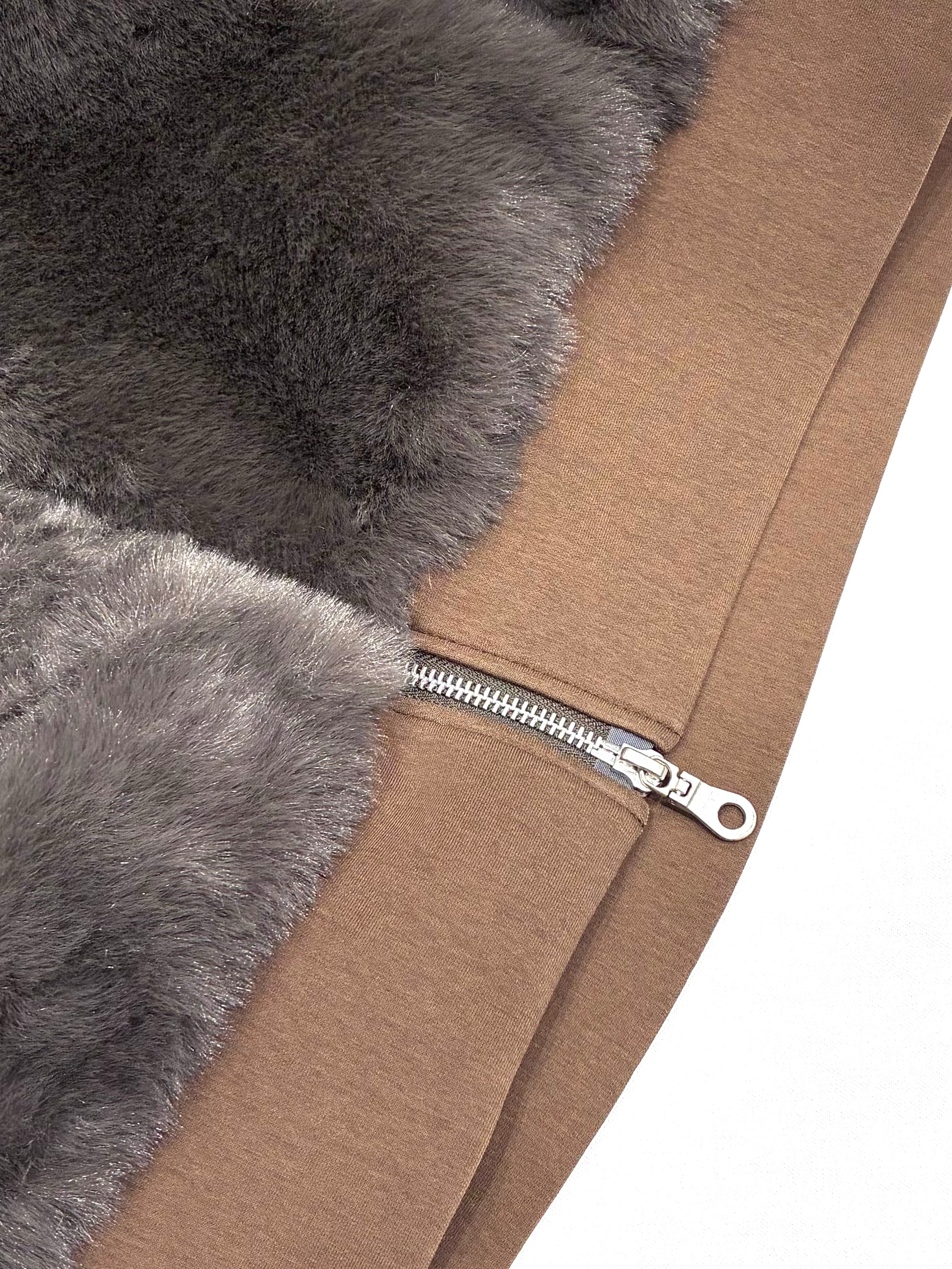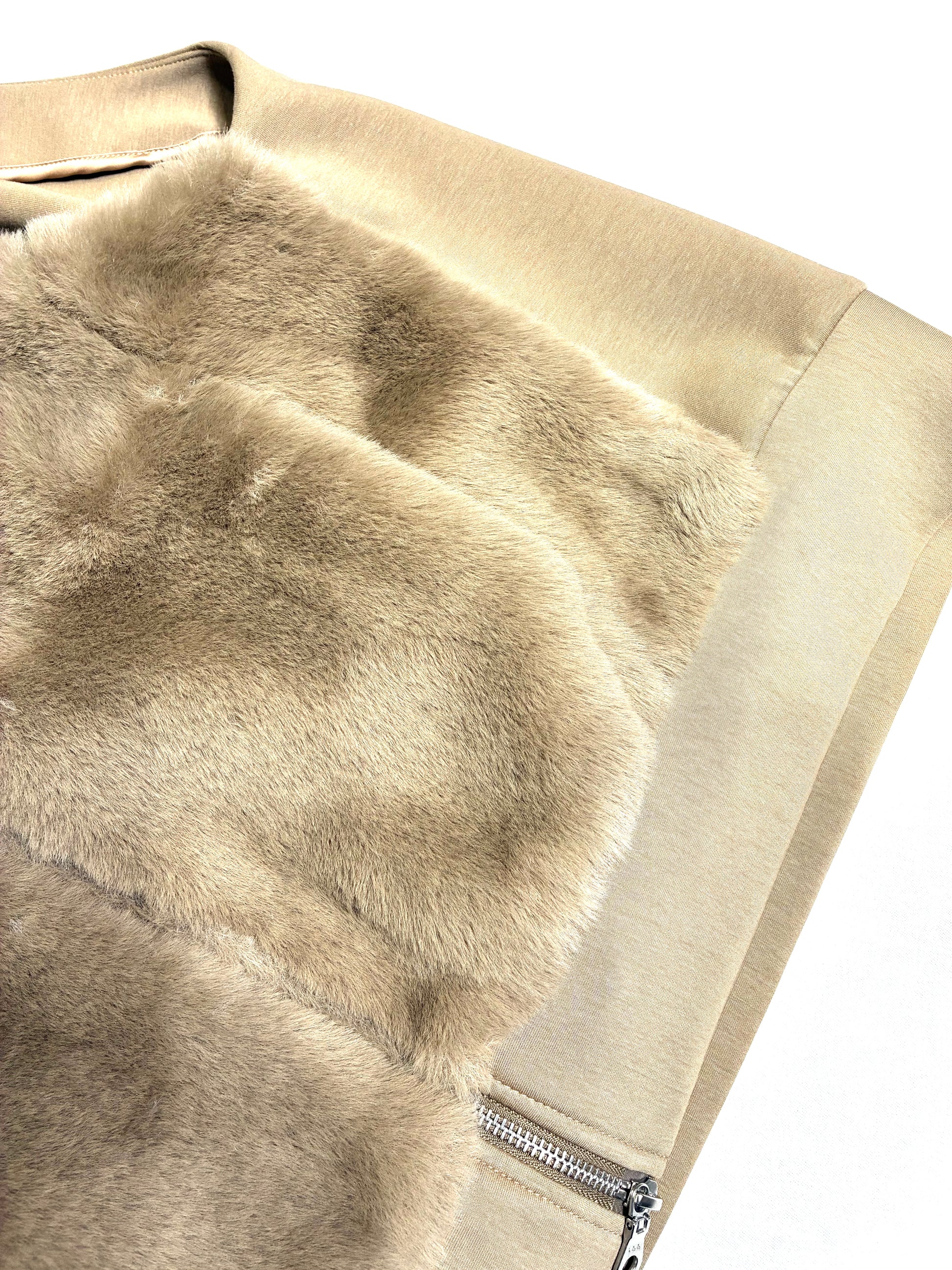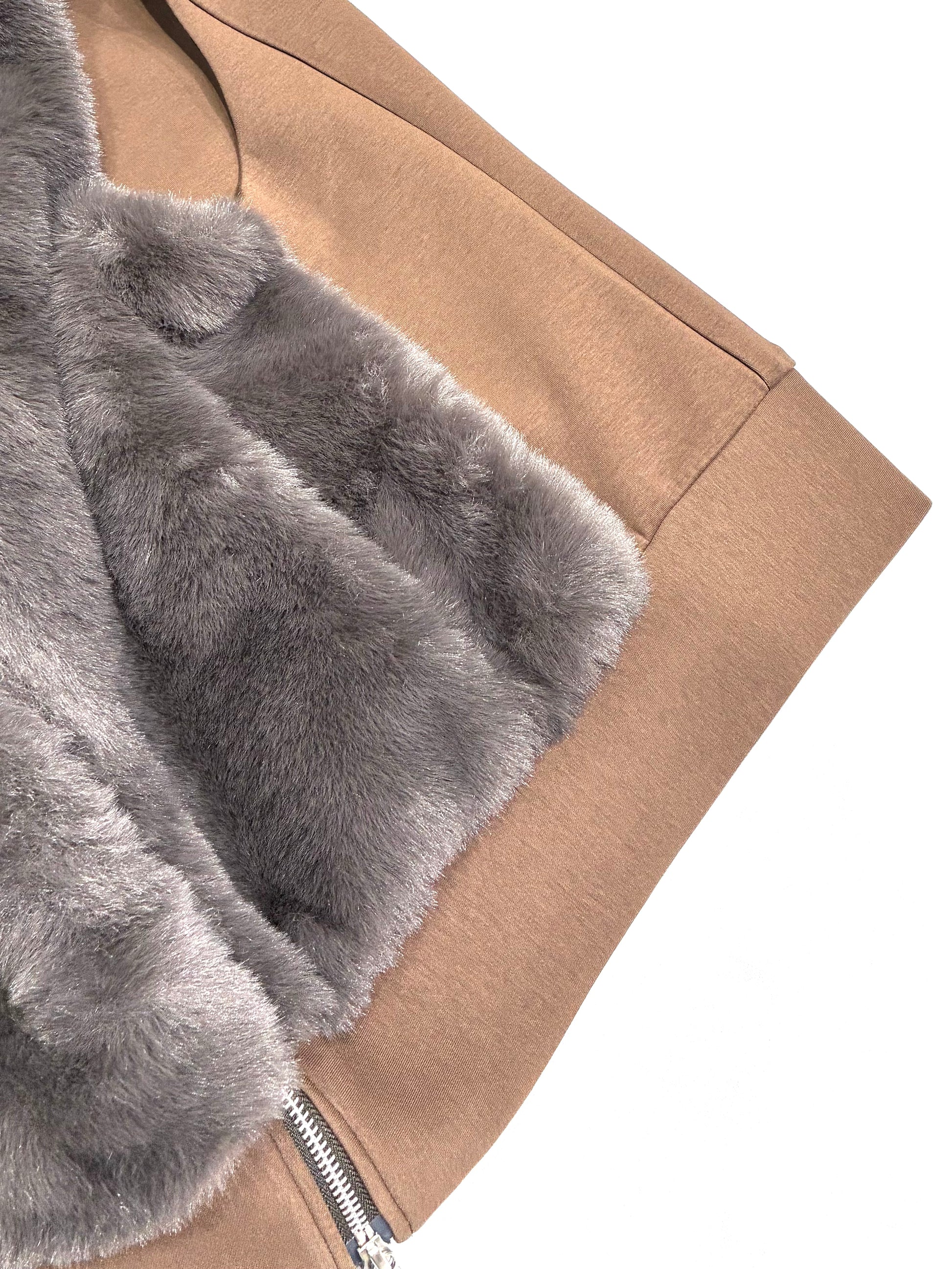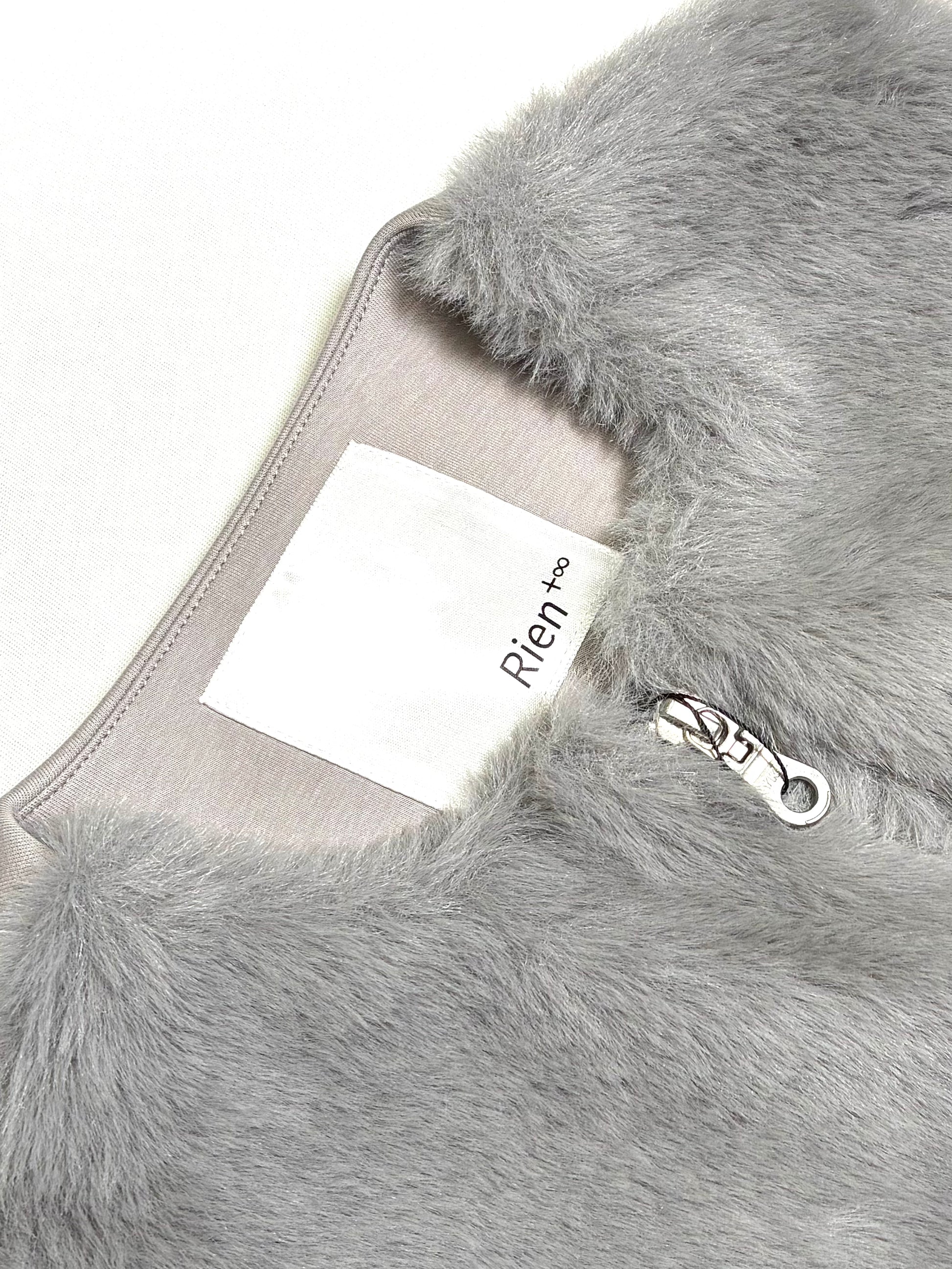 ポリエステル素材のフェイクファーは、見た目以上に軽く、やわらか。さらりとした裏地で、インナーとの摩擦も少なく、重ね着してもストレスを感じません。後ろはカットソー地で伸びがあり、動きやすさとシルエットの美しさを両立しています。