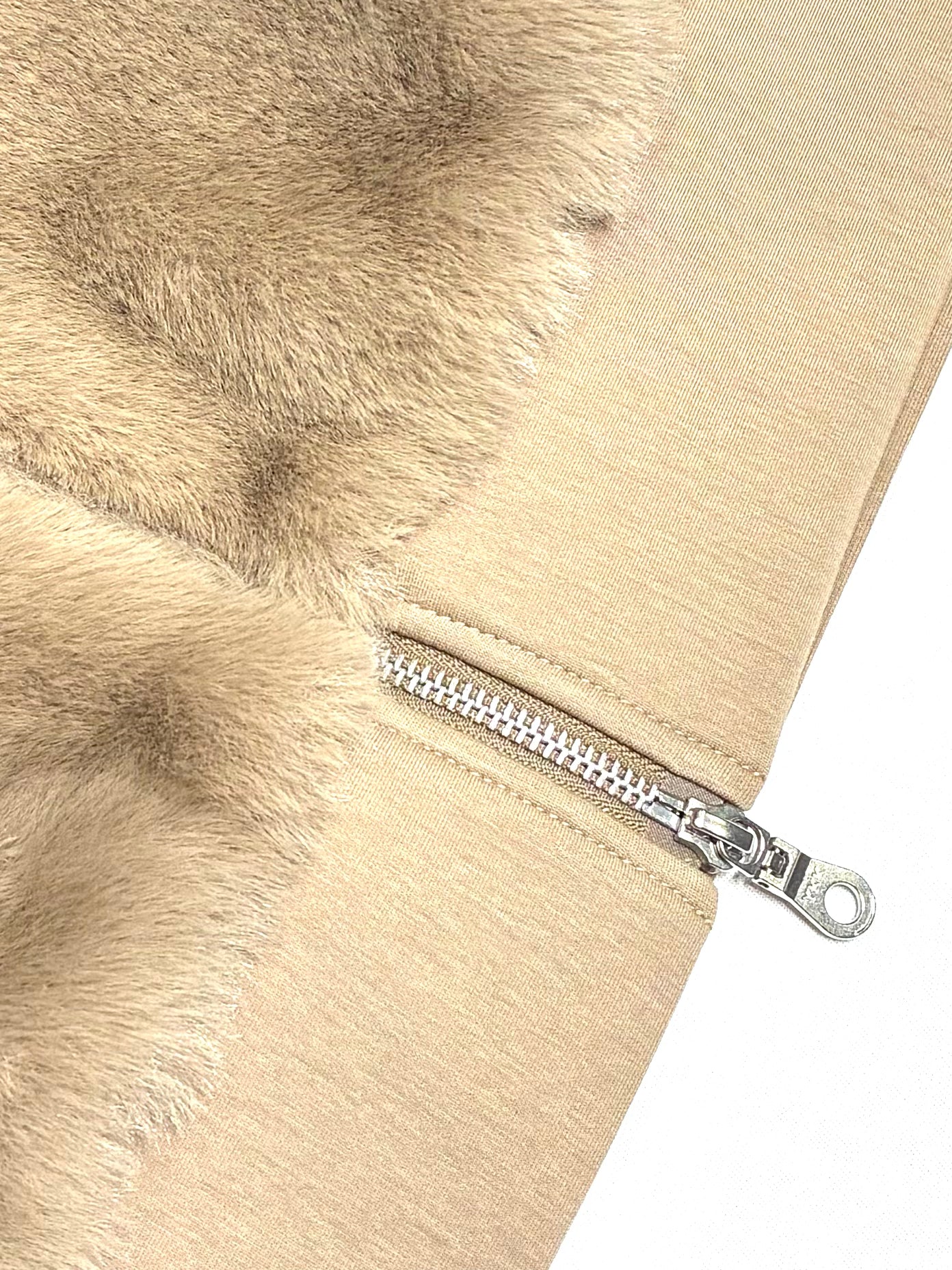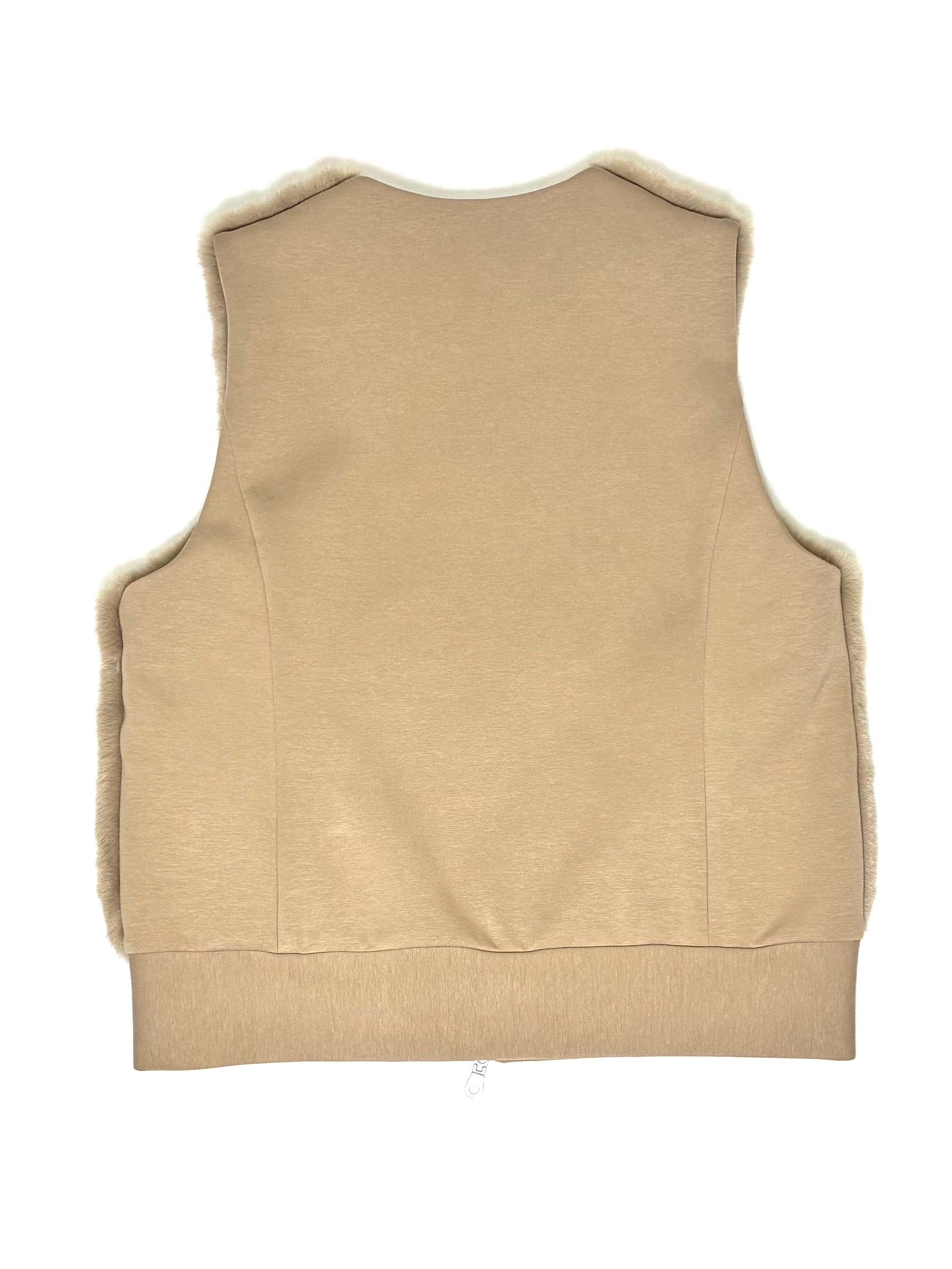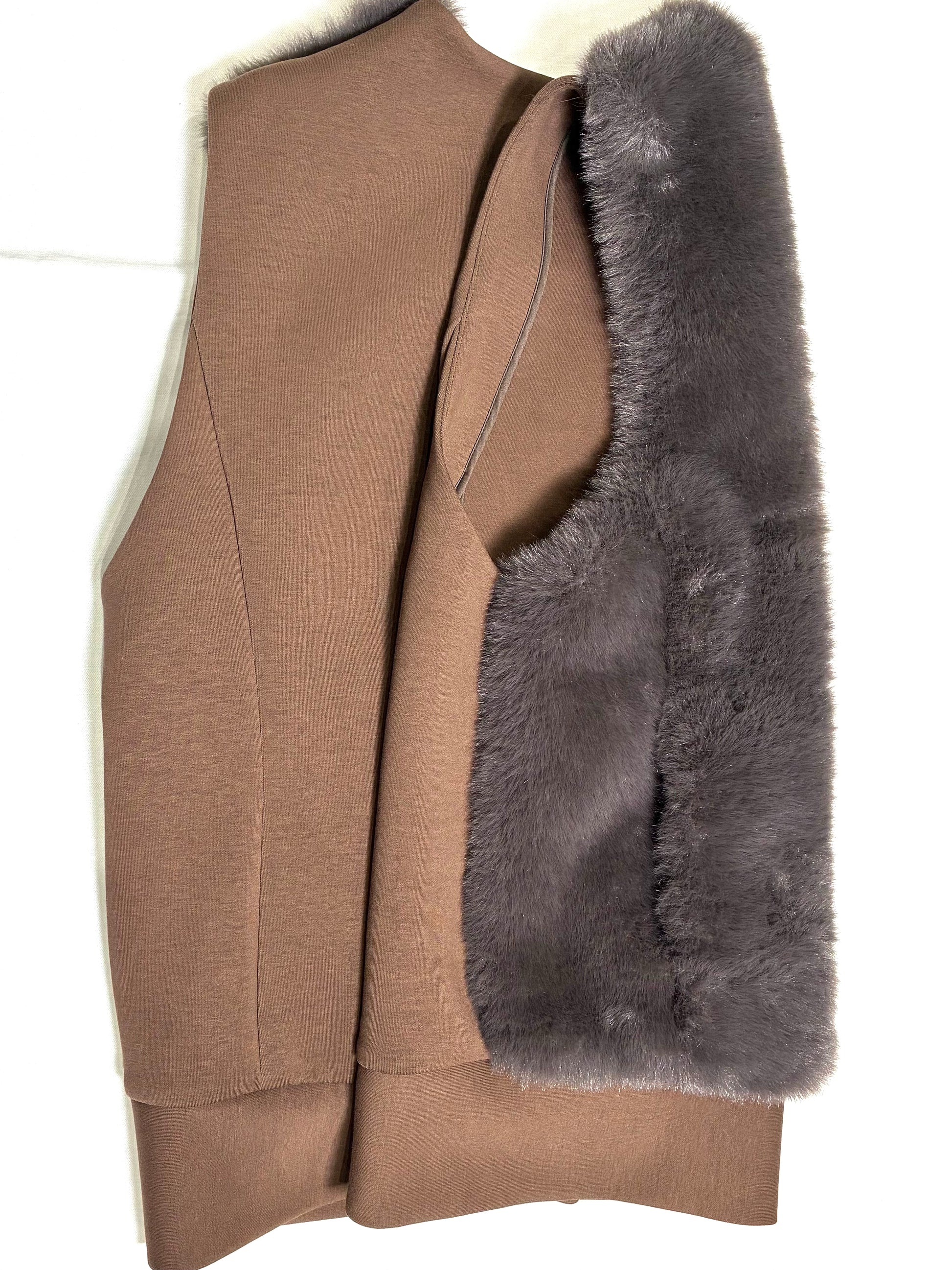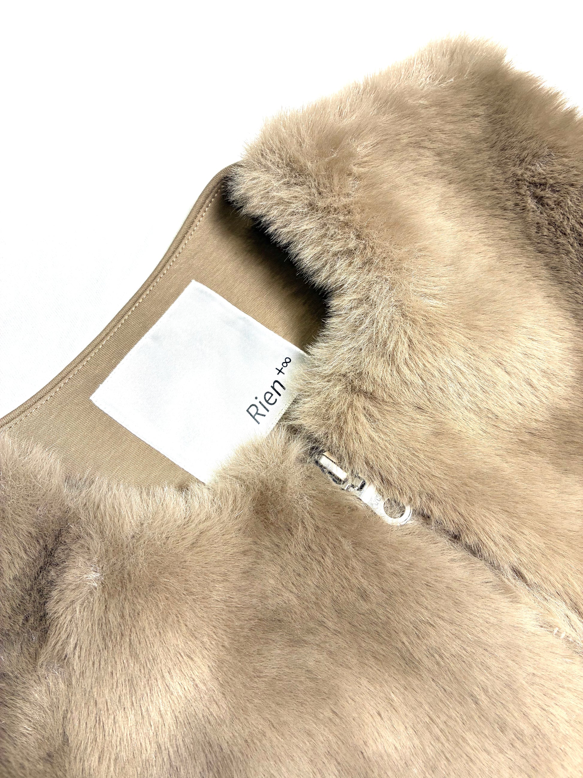 ポリエステル素材のフェイクファーは、見た目以上に軽く、やわらか。さらりとした裏地で、インナーとの摩擦も少なく、重ね着してもストレスを感じません。後ろはカットソー地で伸びがあり、動きやすさとシルエットの美しさを両立しています。