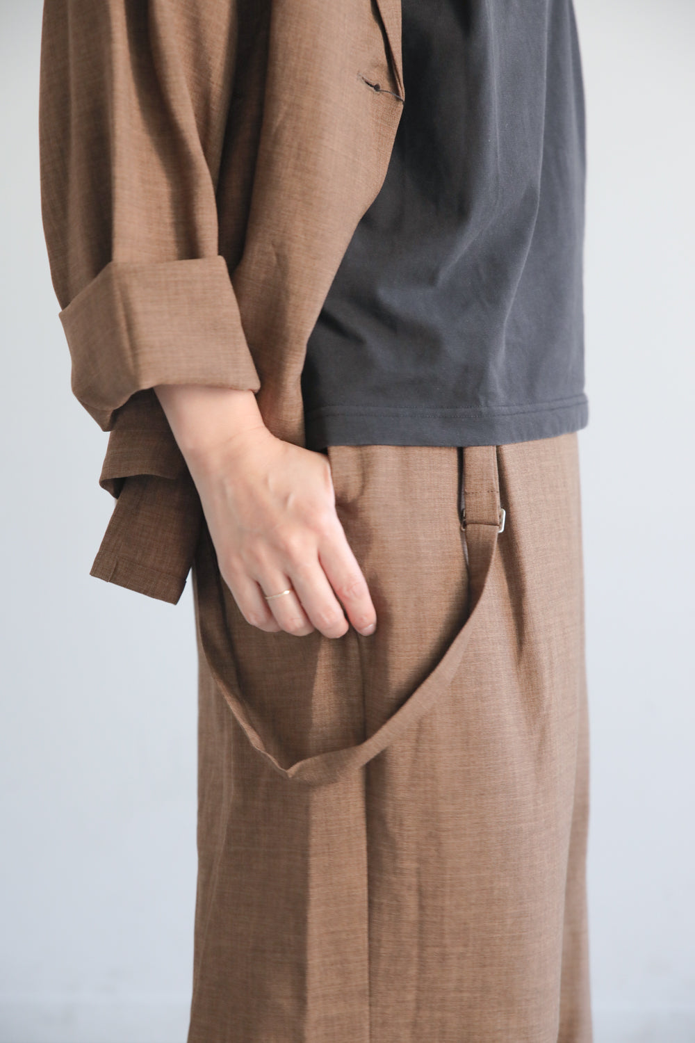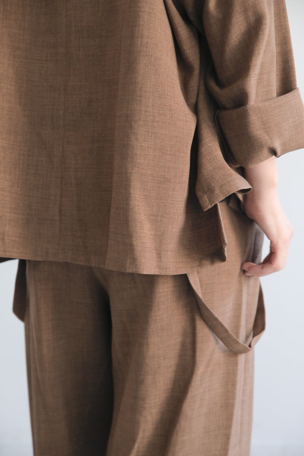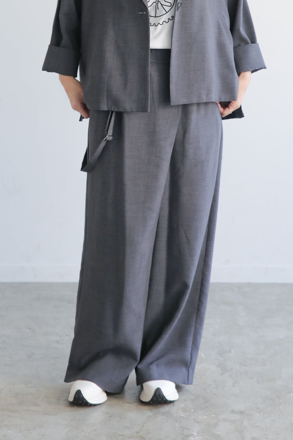 イージーテーラージャケットと同素材の“麻見え”ポリエステルを使用した、きれいめラップ風パンツ。フロントに重なりを持たせたデザインが腰まわりをやさしくカバーし、体のラインを拾いにくいのが魅力です。