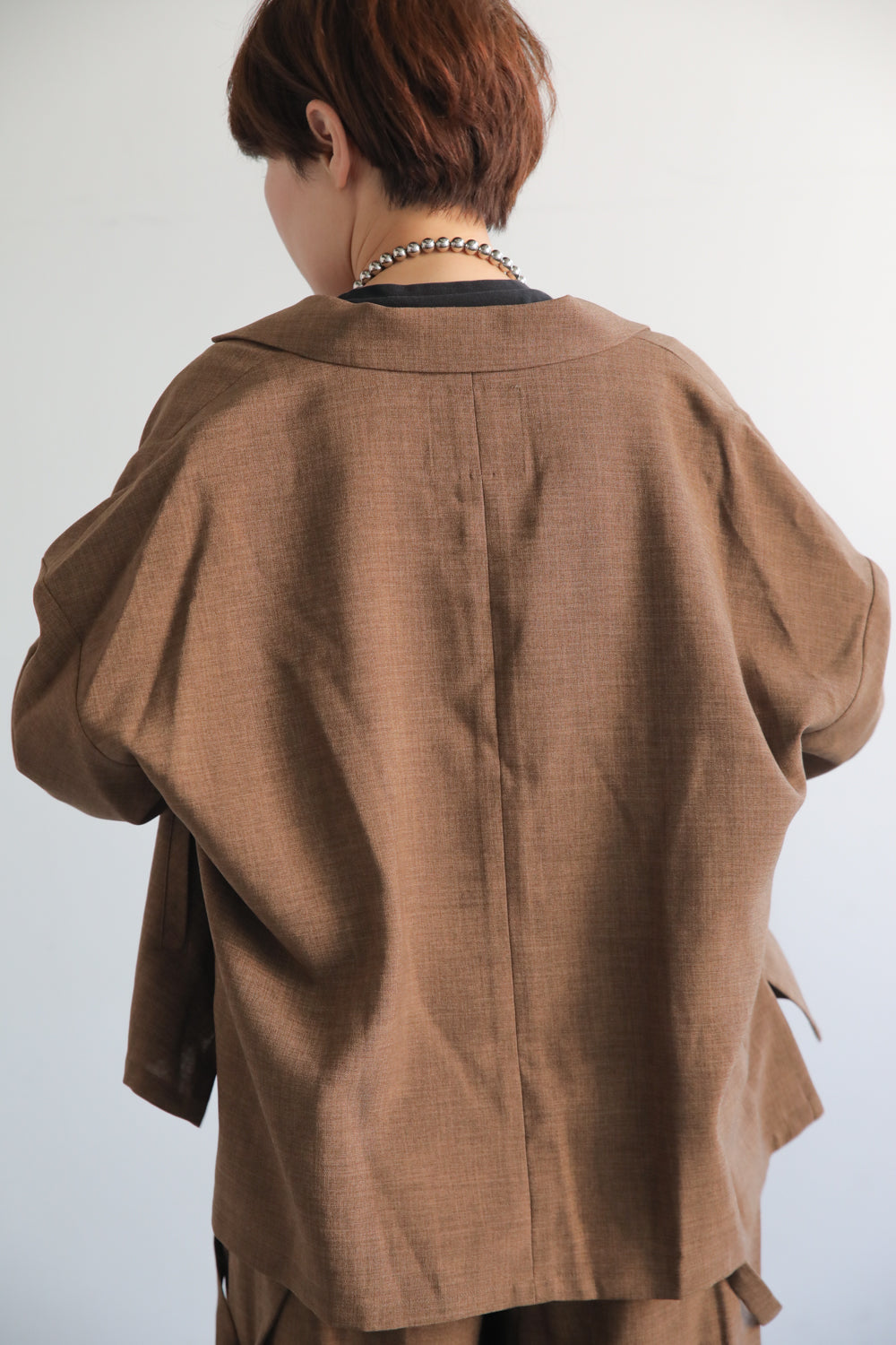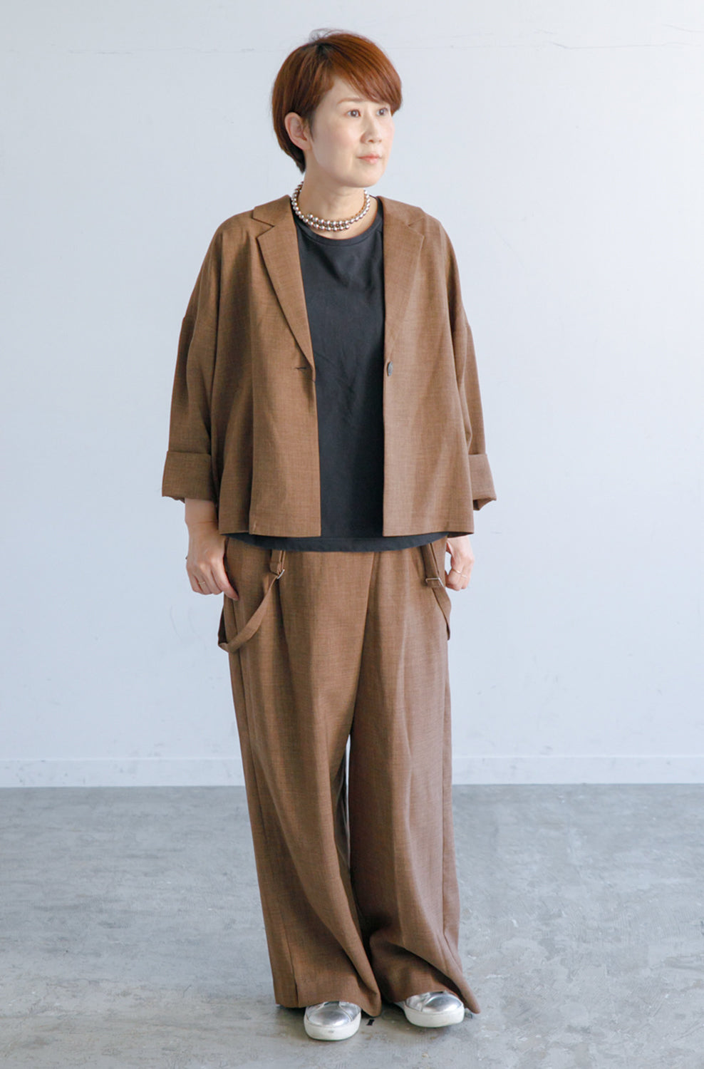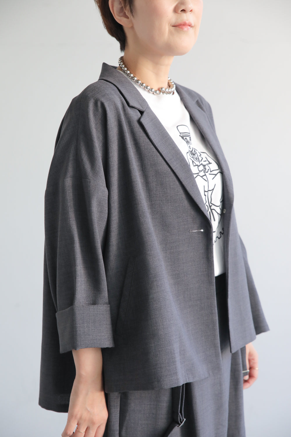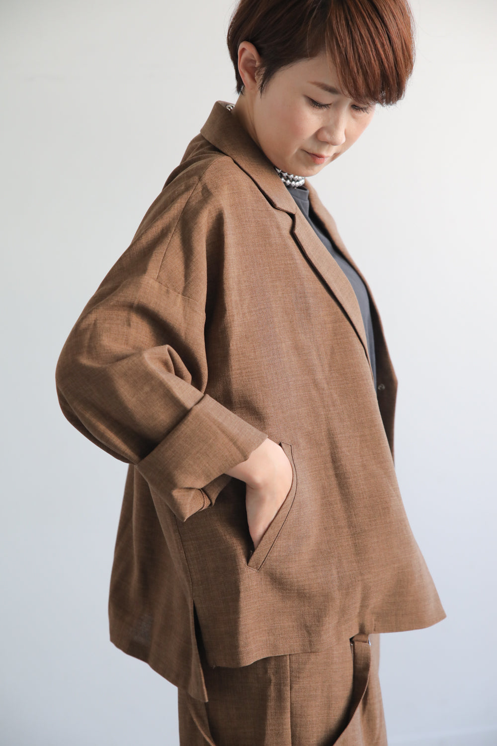 麻のような表情を持つポリエステル素材を採用した、見た目にも清涼感のあるテーラードジャケット。軽さが魅力で、きちんと感はありつつもカーディガン感覚でさらりと羽織れます。