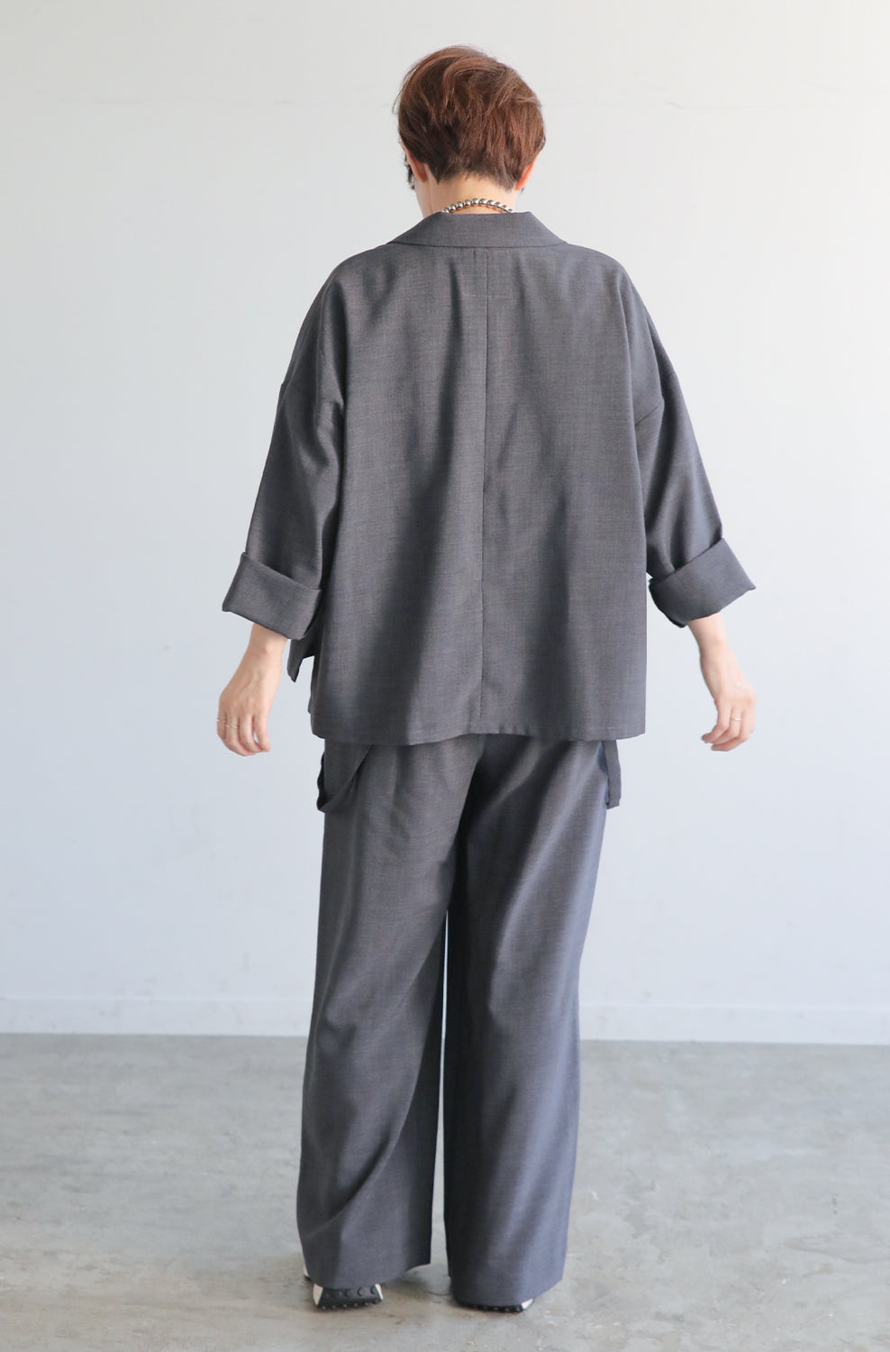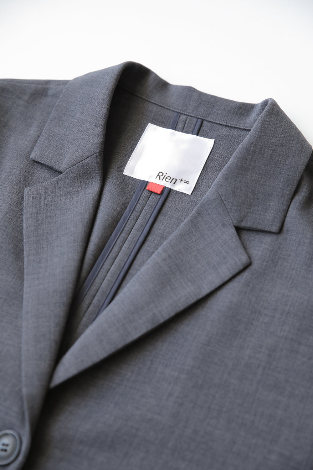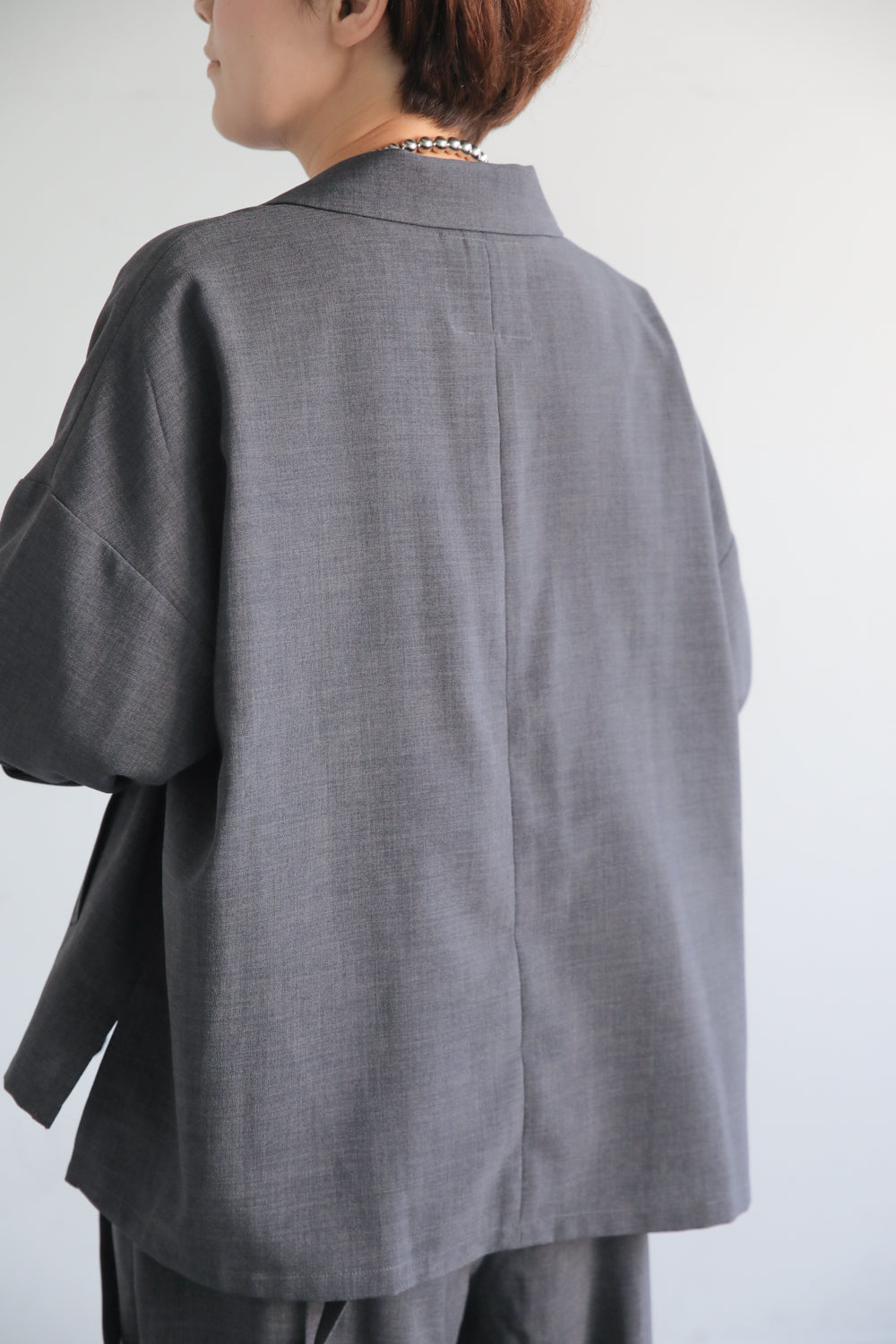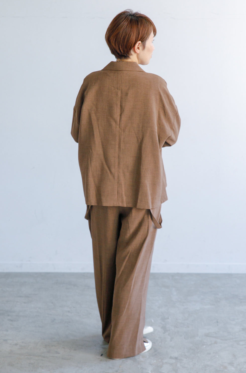 麻のような表情を持つポリエステル素材を採用した、見た目にも清涼感のあるテーラードジャケット。軽さが魅力で、きちんと感はありつつもカーディガン感覚でさらりと羽織れます。